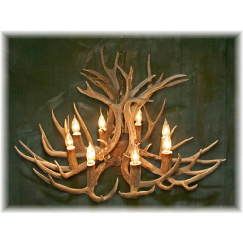 Mule Deer 12 antler 8 light chandelier. Made similar to the whitetail 12 antler 8 light chandelier except larger. Measures approx 34-38" diameter and is approx 20-24" tall. Comes with as much chain and wire as needed. Makes a great dining or entryway light for your log cabin, or rustic decor. While most chandeliers adapt well to shades, rawhide shades are not included unless noted on the initial order. Please allow 4-6 weeks for delivery.
