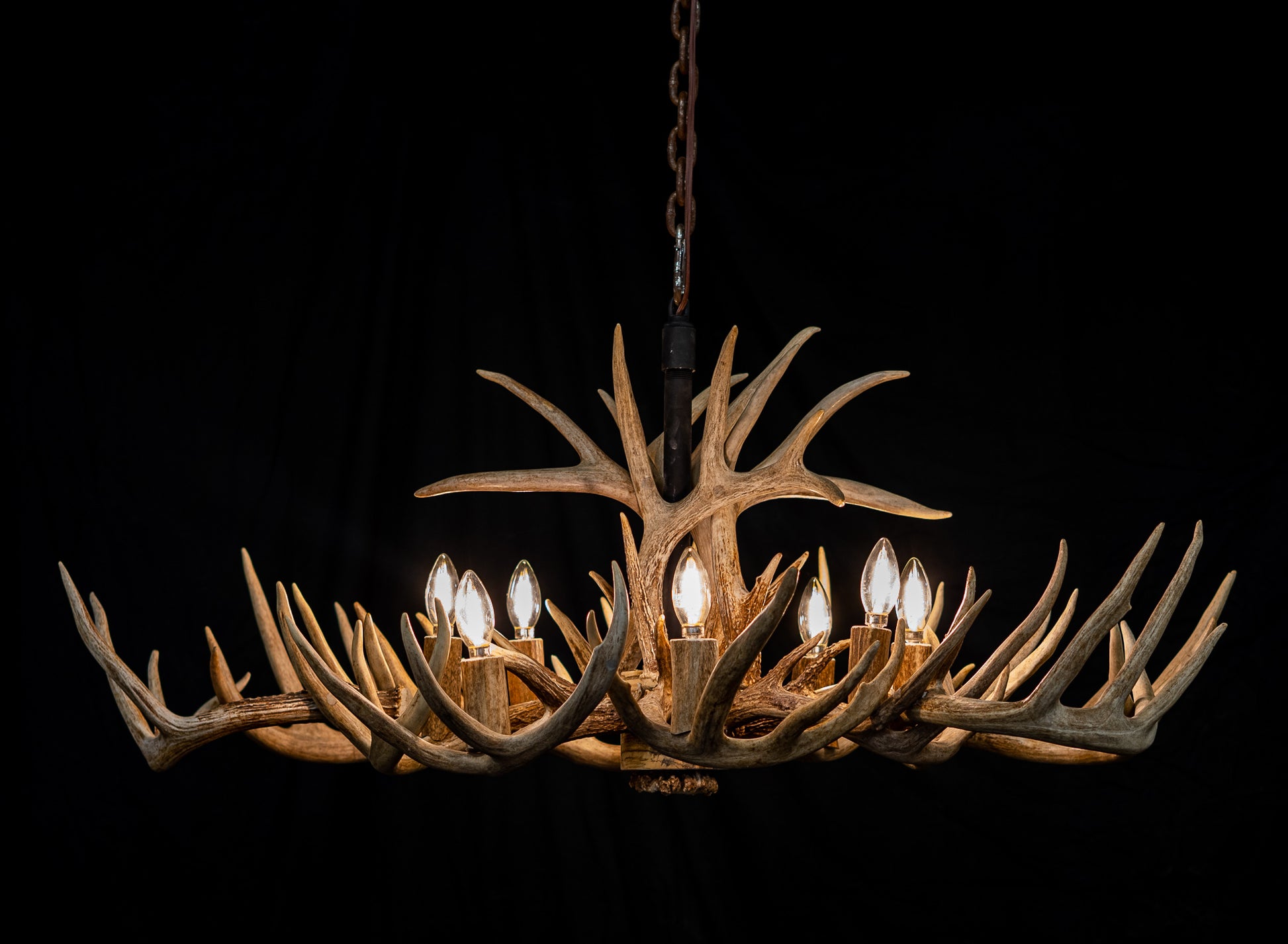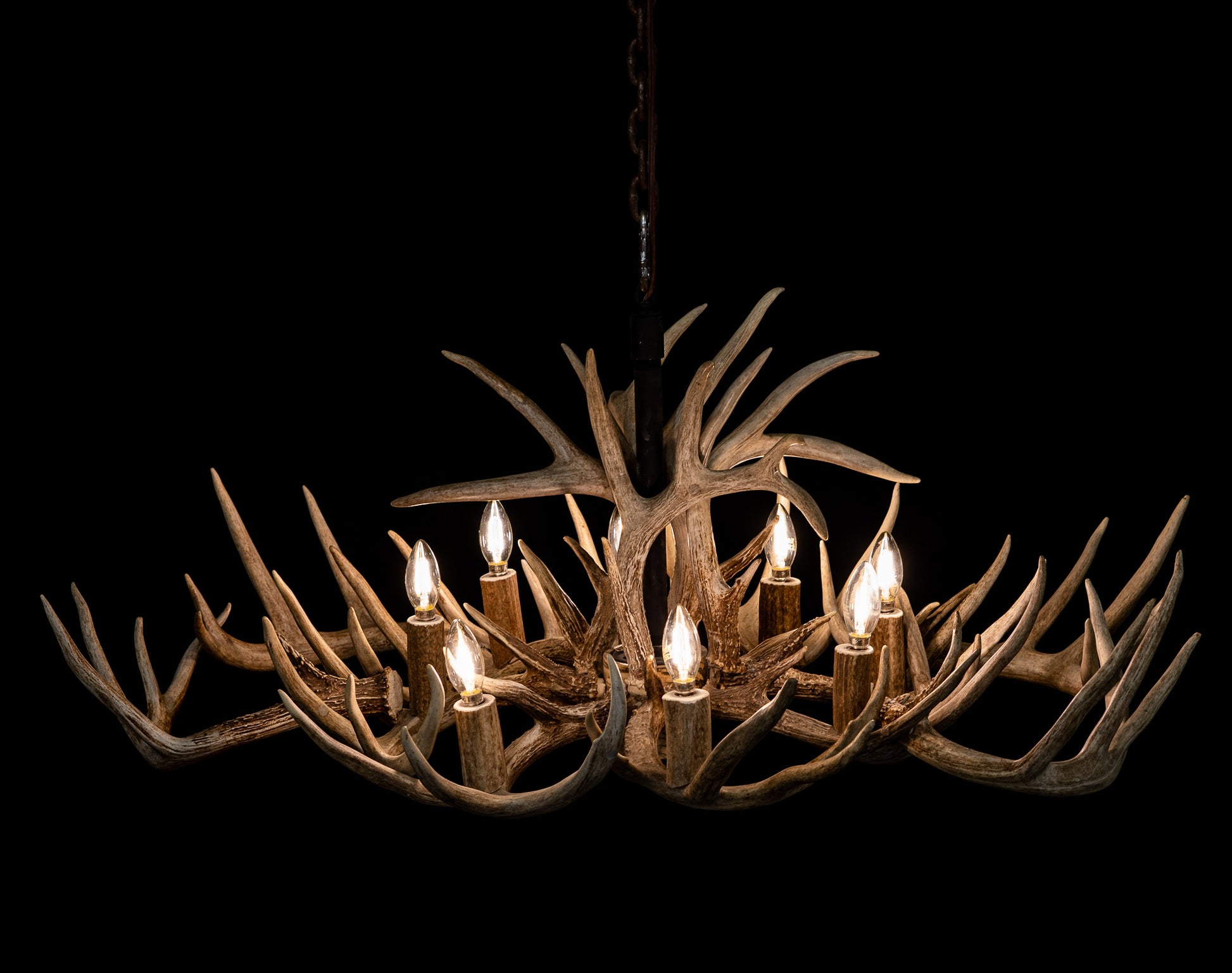 16 antler, 8 light oblong whitetail chandelier. 30" wide, 42+" long and approximately 18" tall. All wiring is inside antlers and the antlers are screwed together then patched and colored to matched. All parts are ul listed. While most chandeliers adapt well to shades, rawhide shades are not included unless noted on the initial order. Please allow 6-8 weeks for delivery.