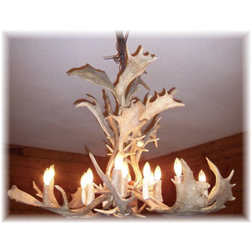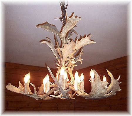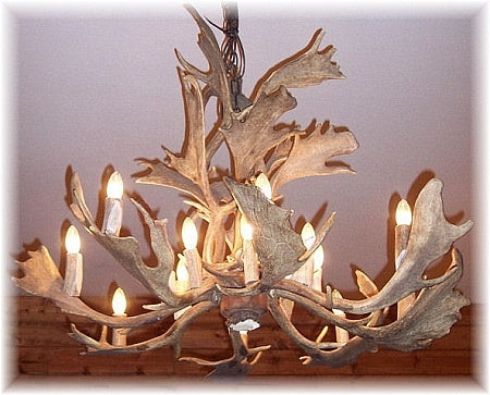 Fallow Deer Antler Cascading 16 light 17 antler chandelier. Measures approx 42"+ diameter and 42"+ tall. All wiring is inside antlers and all parts ul listed. While most chandeliers adapt well to shades, rawhide shades are not included unless noted on the initial order.