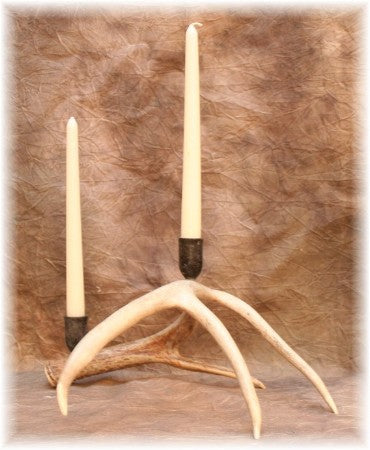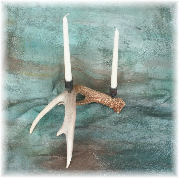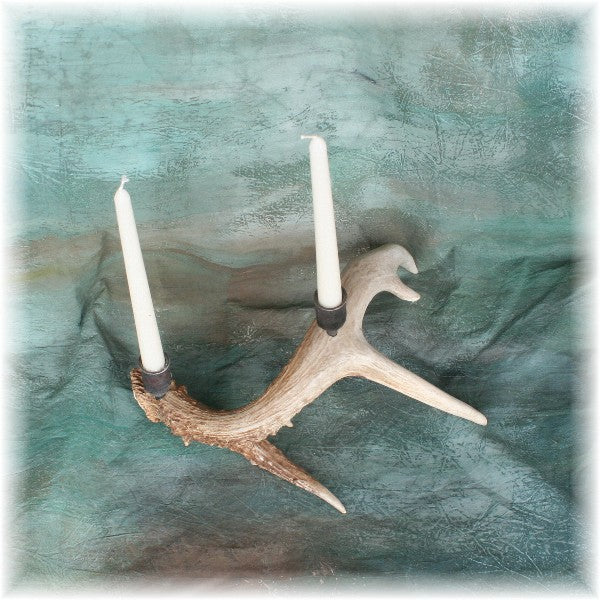 Whitetail Deer Antler Candelabra with 2 hand-forged taper cups. Made with a medium whitetail deer Grade A antler shed. Also available with three candle cups. Candle Not included.