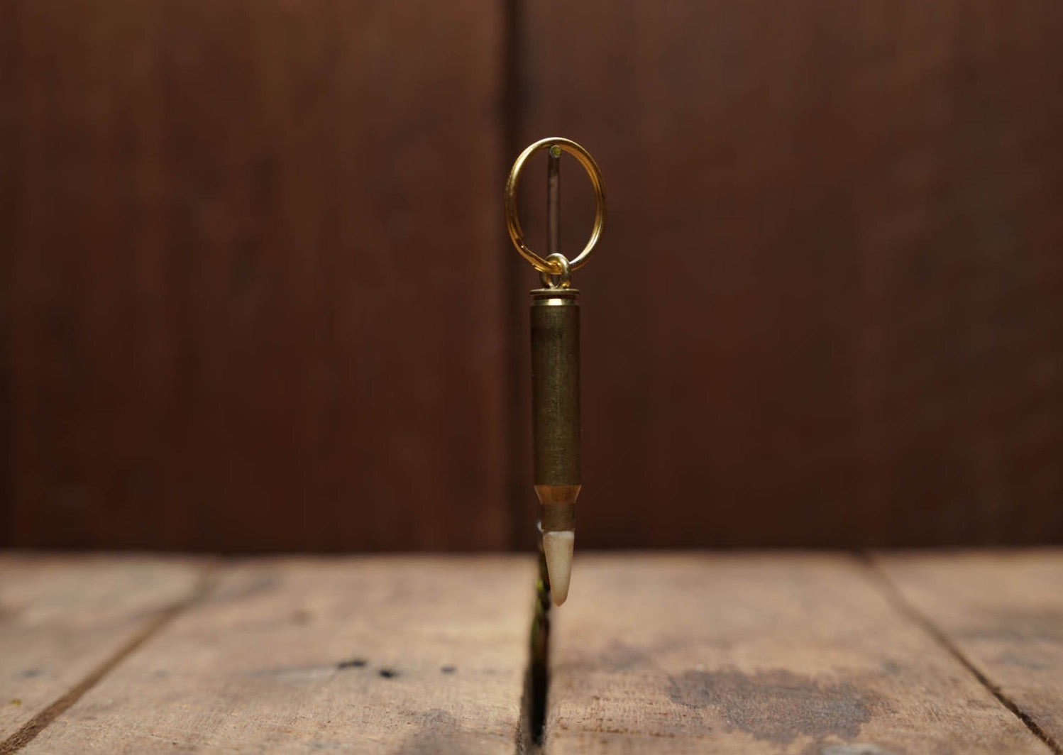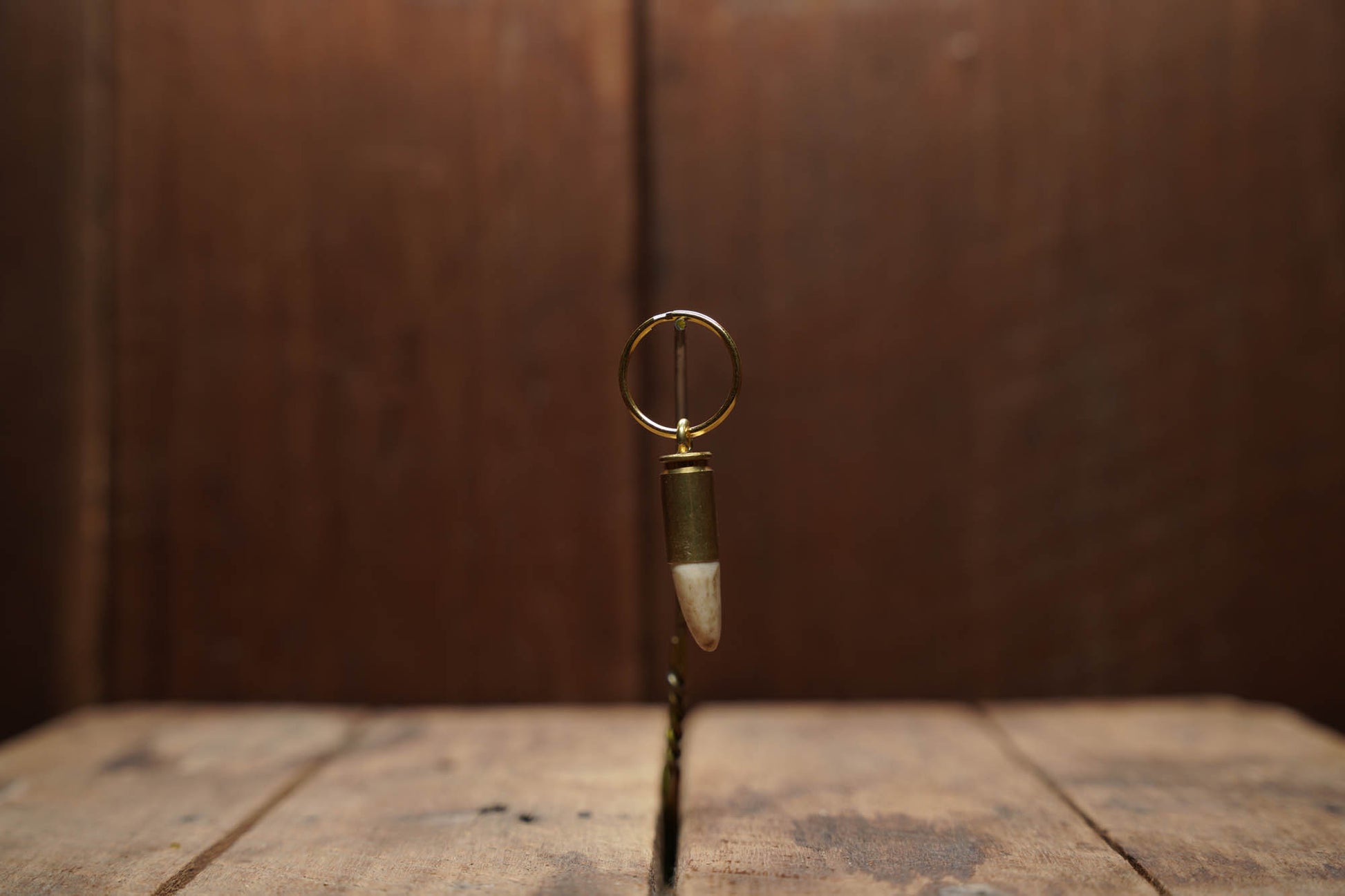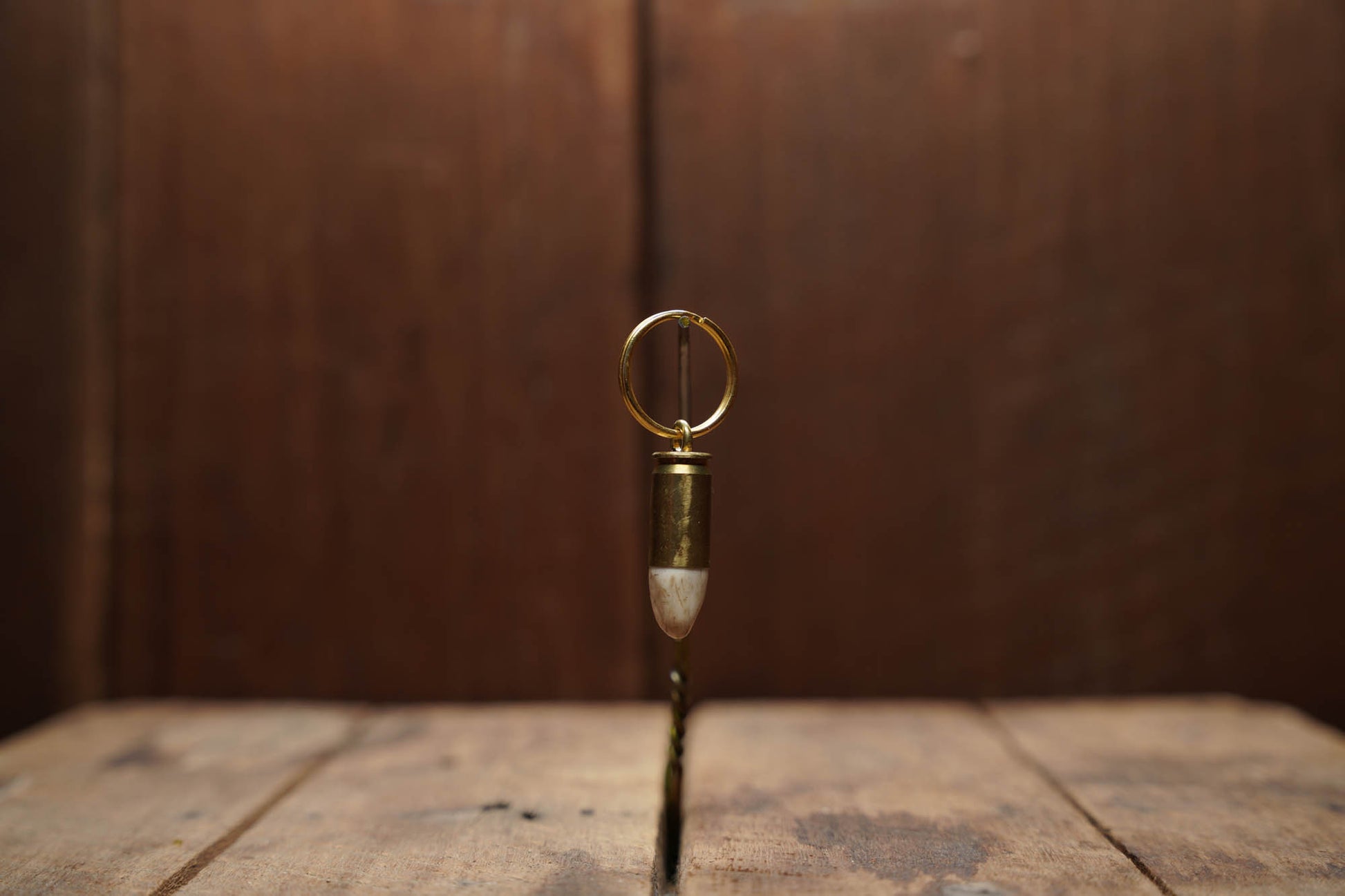 Deer Antler Bullet Keychain made using spent rounds. We make each by hand using spent brass that we clean inside and out removing all gun powder etc. completetly harmless. Each will vary slightly as the tips are all different we fit each tip individually to each round. There will be mixed headstamps on the brass as well. Can also be used as a necklace.. Wholesale Inquiries Welcome