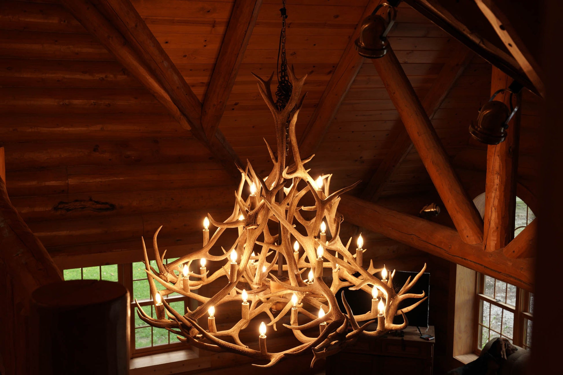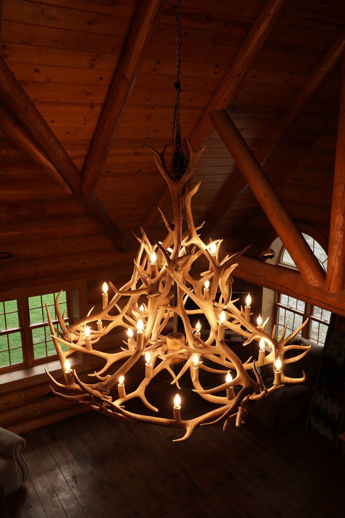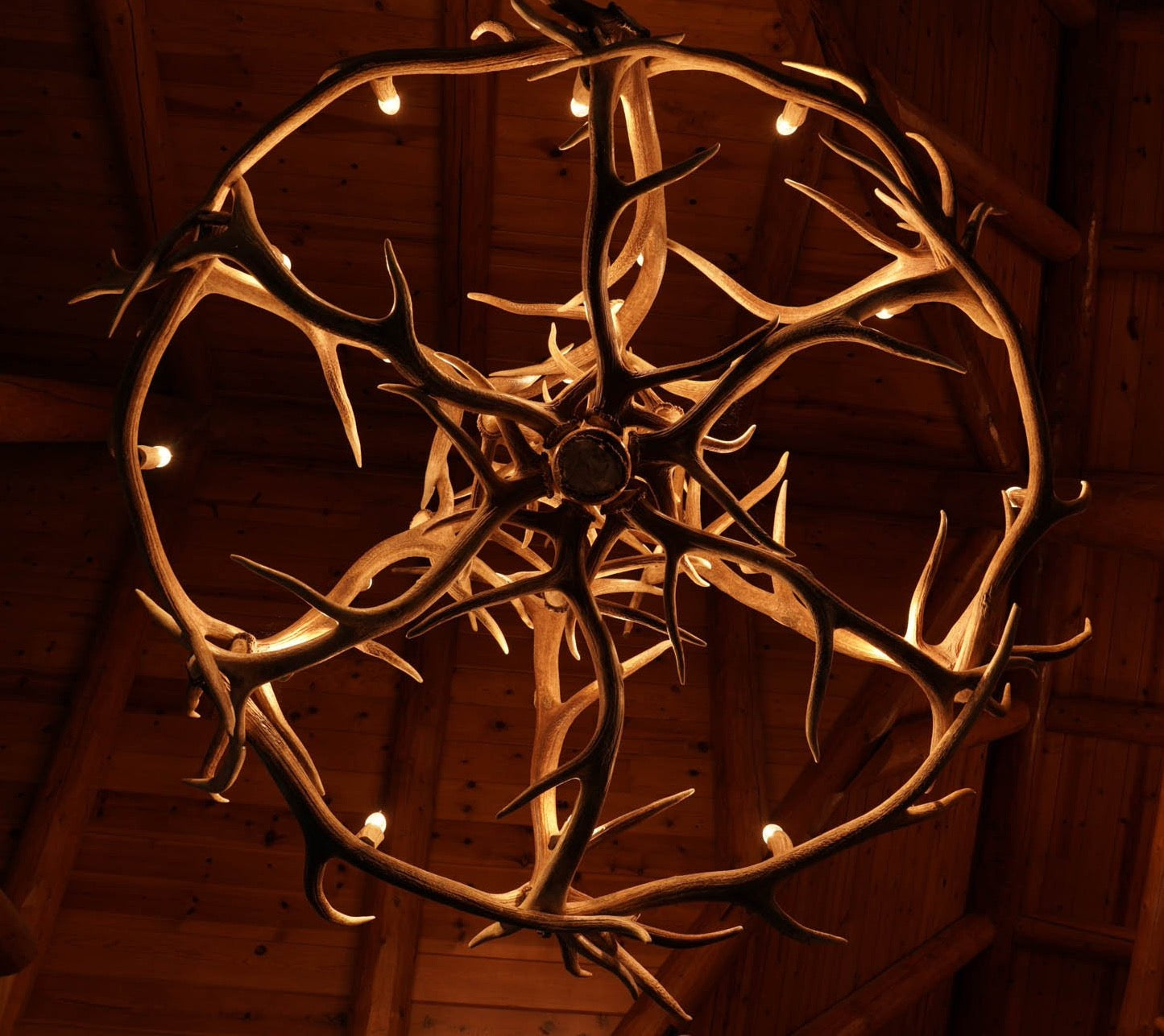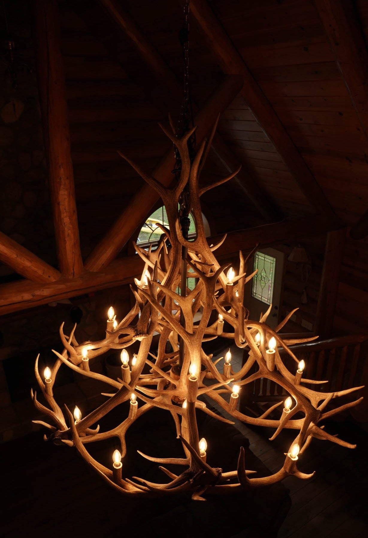 This elk antler chandelier is constructed using 24 Grade A shed elk antlers and includes 27 hand crafted authentic antler candelabra socket covers and chain. This piece has a bottom diameter of approximately 72" with an approximate height of 62". Wiring is inside the antlers and the antlers are screwed together. All screw holes are patched and colored to blend seamlessly with the natural beauty of the antlers.