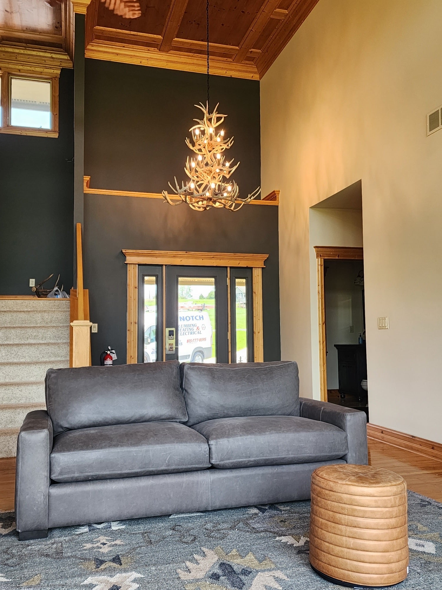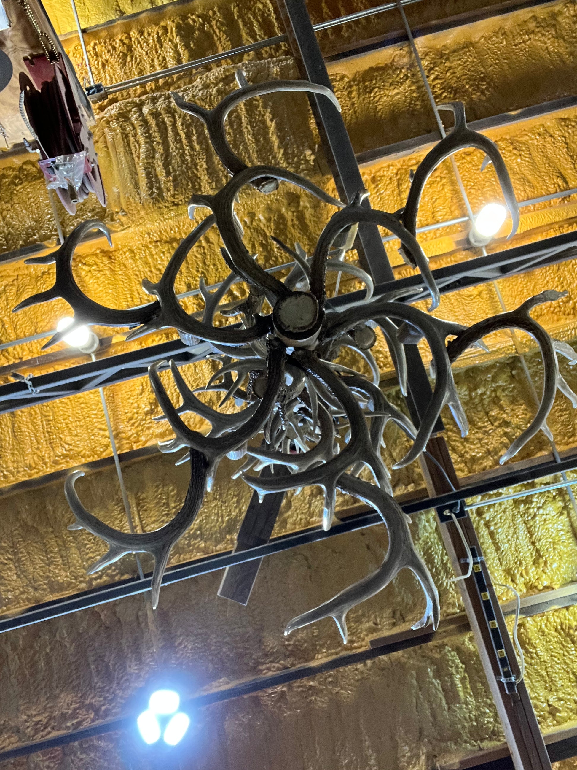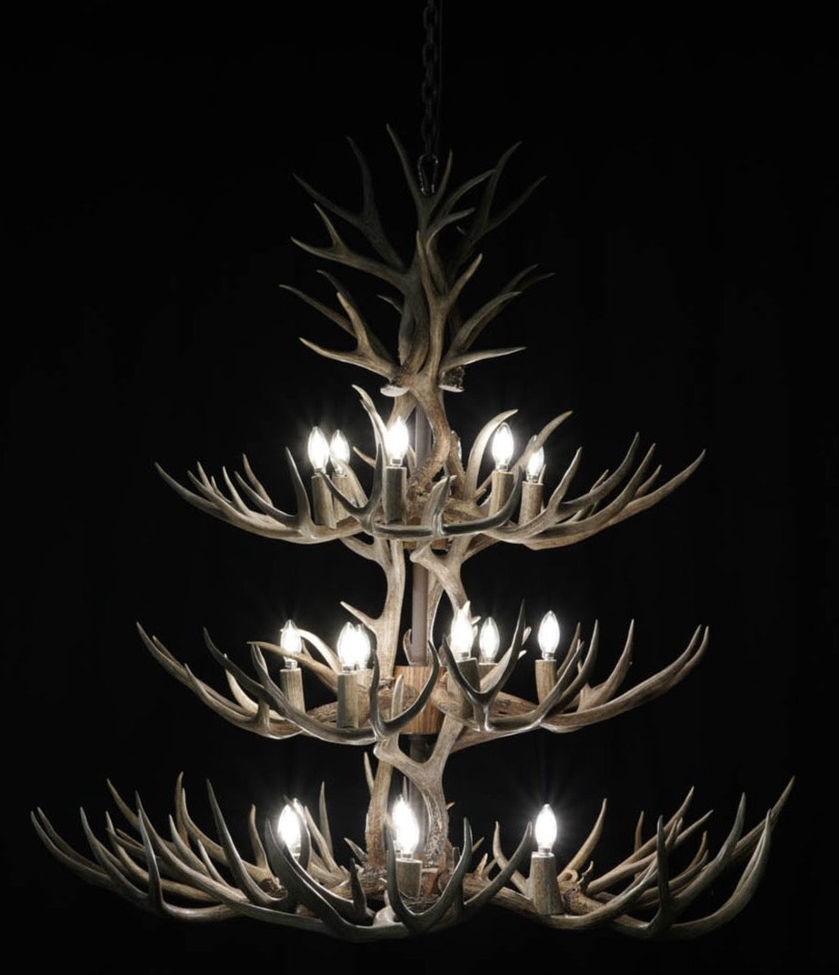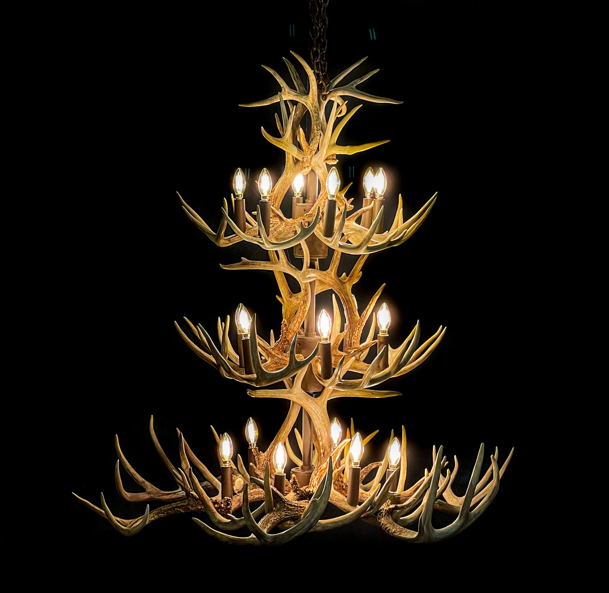 Three Tier Cascading Mule Deer 36 Antler 18 light. Made with large fresh mule deer sheds. Measures approx 48-54" diameter by 48-54" tall. Comes with as much heavy chain and wire as needed. While most chandeliers adapt well to shades, rawhide shades are not included unless noted on the initial order.