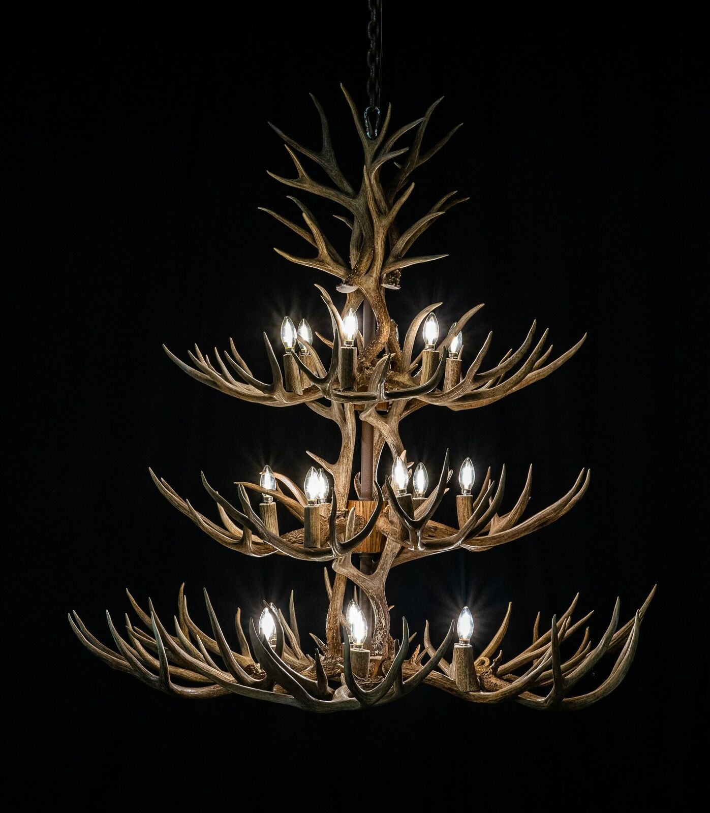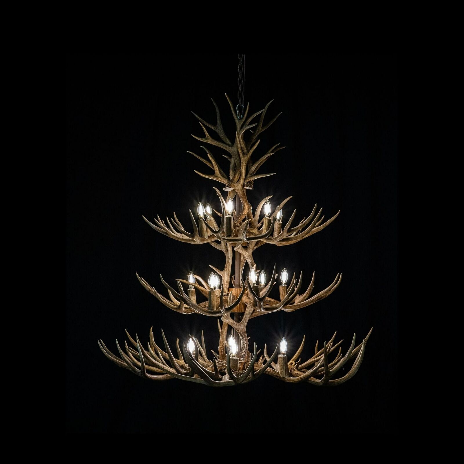 Three Tier Cascading Mule Deer 36 Antler 18 light. Made with large fresh mule deer sheds. Measures approx 48-54" diameter by 48-54" tall. Comes with as much heavy chain and wire as needed. While most chandeliers adapt well to shades, rawhide shades are not included unless noted on the initial order.