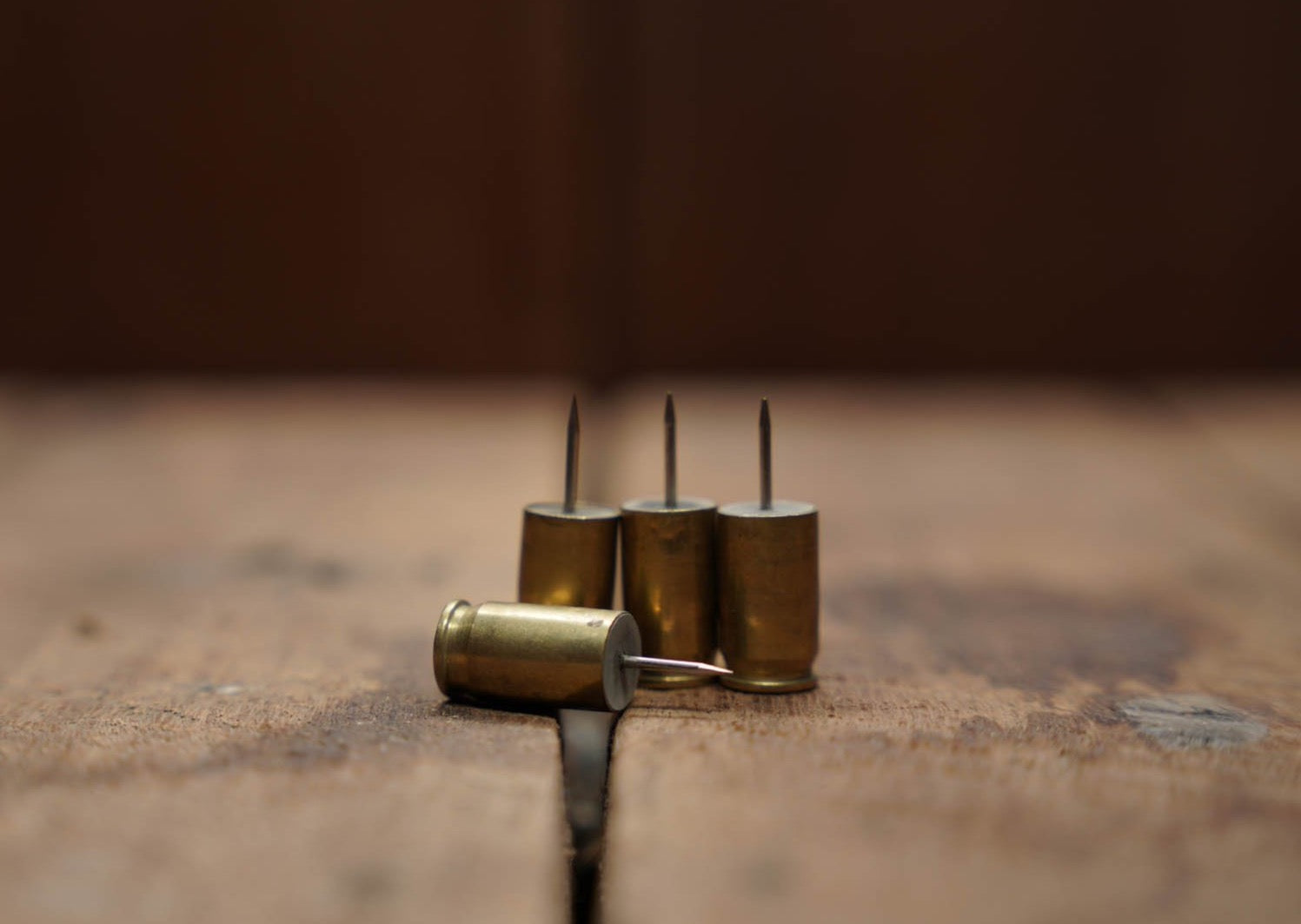 380 spent brass pistol round set of 4 push pins. We make each by hand using spent brass that we clean inside and out removing all gun powder etc. completetly harmless. We glue in clear push pins flush with the brass where bullet would be giving you the entire pin to hold all your important papers. There will be mixed head stamps on the brass as well.