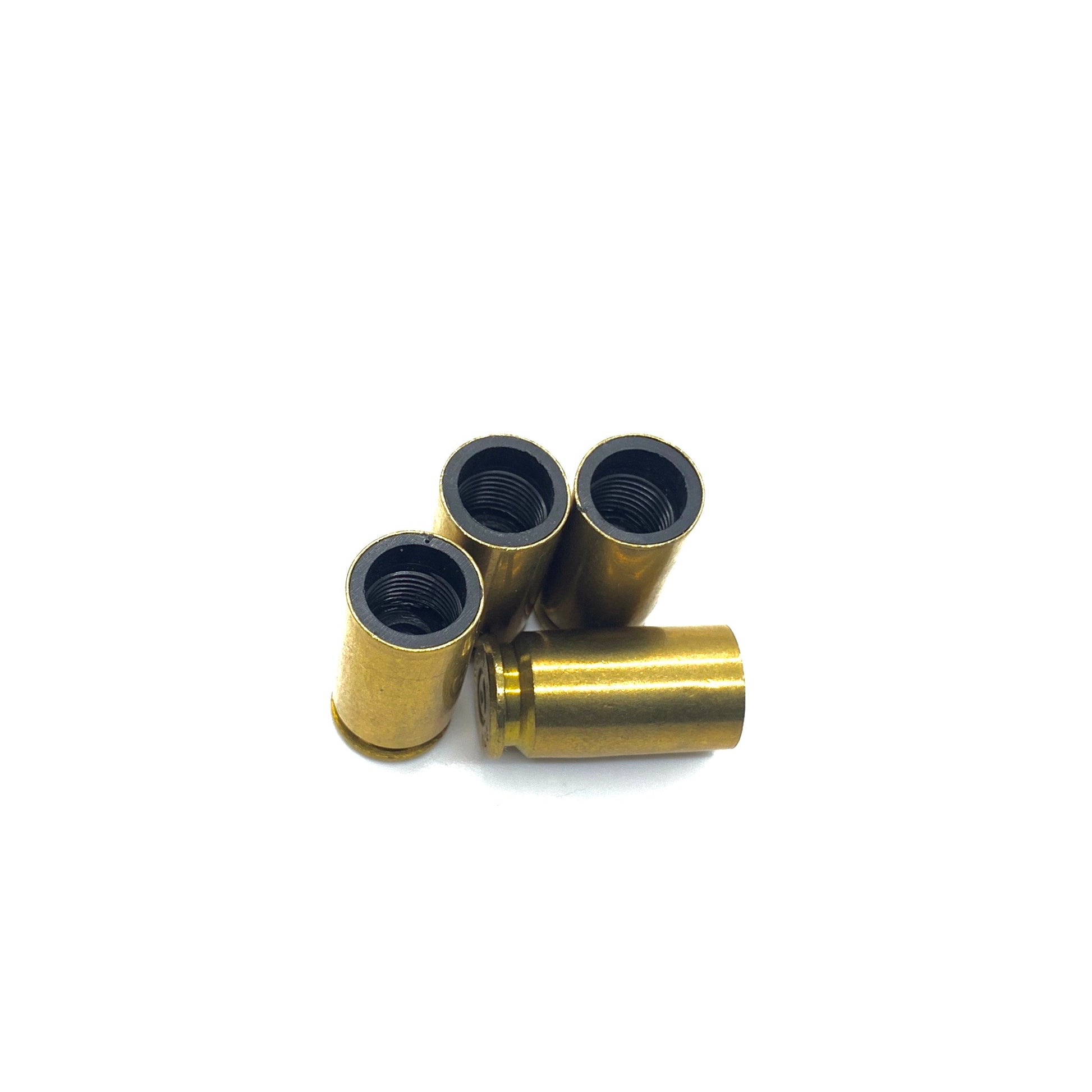 40 S & W Spent Brass Set of 4 Valve Stem Caps. We clean each round inside and out removing all gun powder making them completely harmless. We then insert a black plastic valve stem cap. These will work great on any vehicle, ATV, Bike etc.