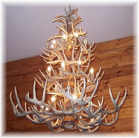 Whitetail Deer Antler 3 tier chandelier 52 antlers 24 lights. Made with real top quality shed antlers. Measures approx diameter 42-46” and 50+ tall. Wiring is inside the antlers. All parts are ul listed. Real antler socket covers shaped to the antlers. 100% satisfaction guarantee. While most chandeliers adapt well to shades, rawhide shades are not included unless noted on the initial order.