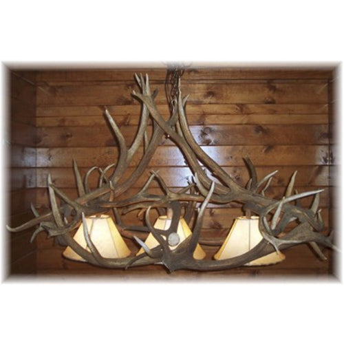 Our elk antler pool table chandelier is constructed using 13 Grade A shed elk antlers and measures approximately 60-68" x 36" with a height of 32-36" and includes three 14" rawhide shades and antique brass chain. Wiring is inside the antlers and the antlers are screwed together. All screw holes are patched and colored to blend seamlessly with the natural beauty of the antlers.