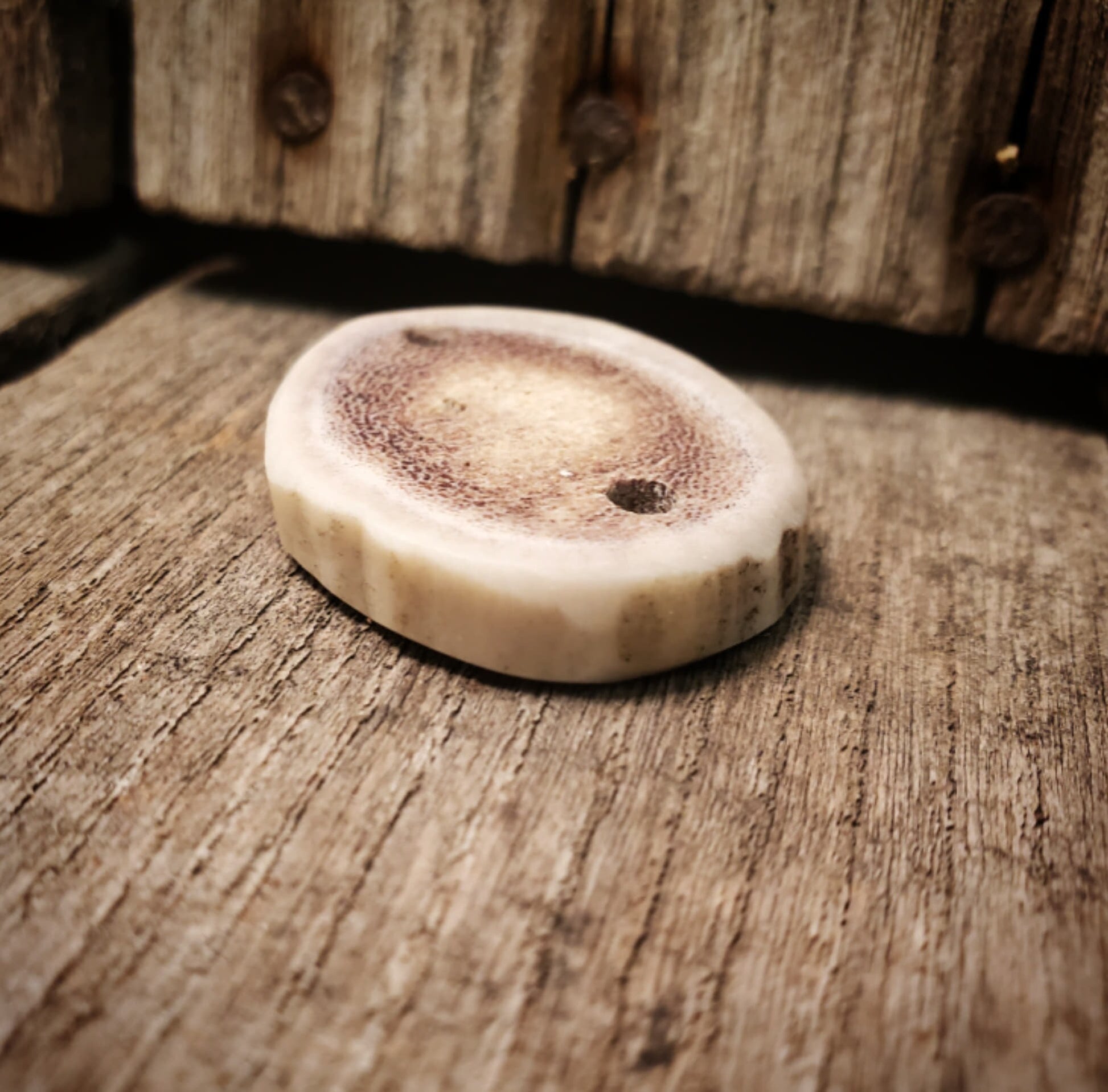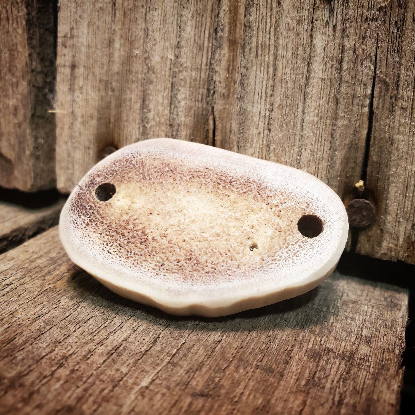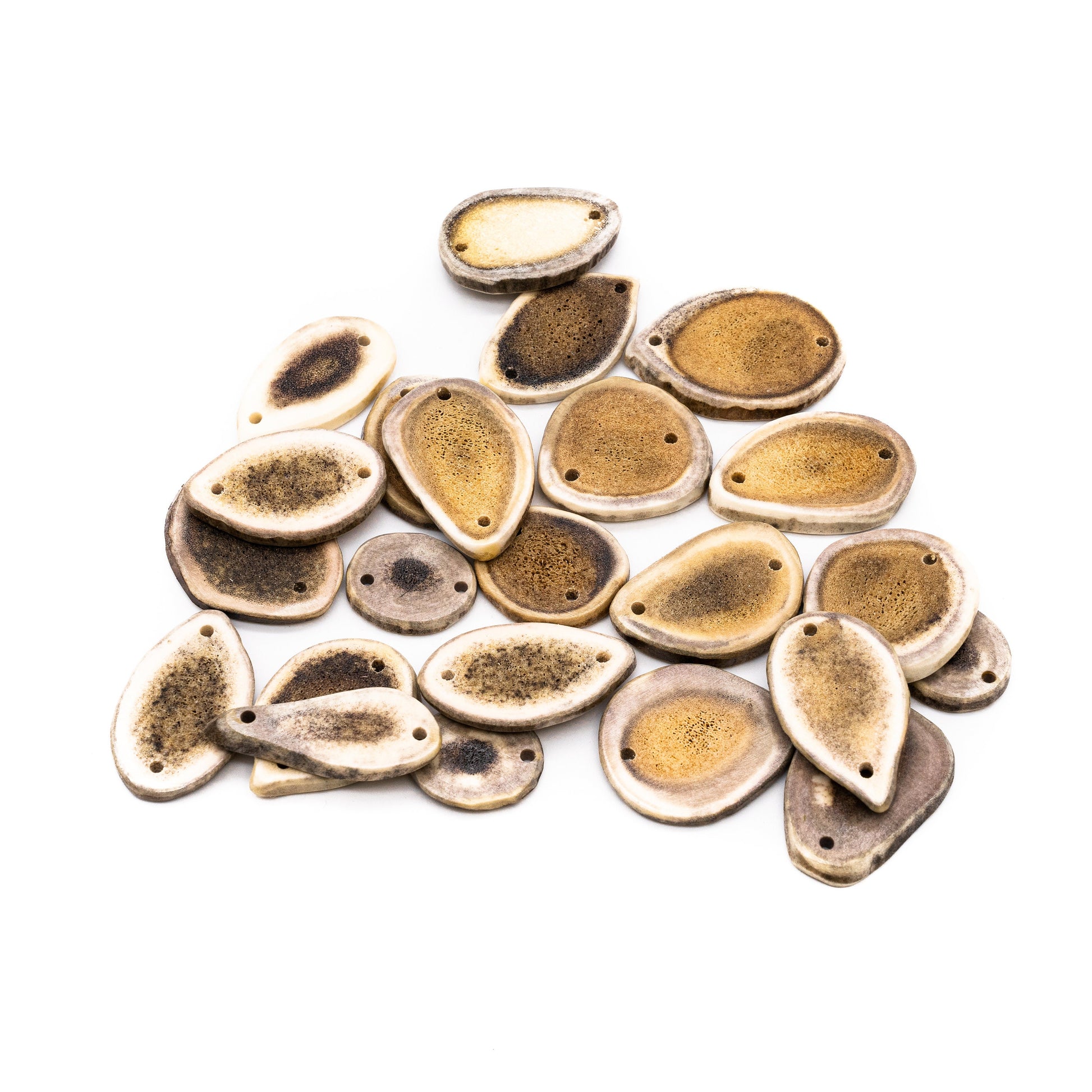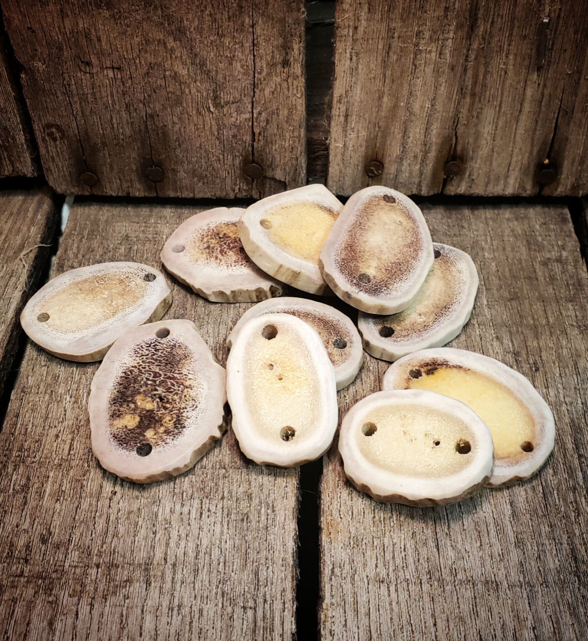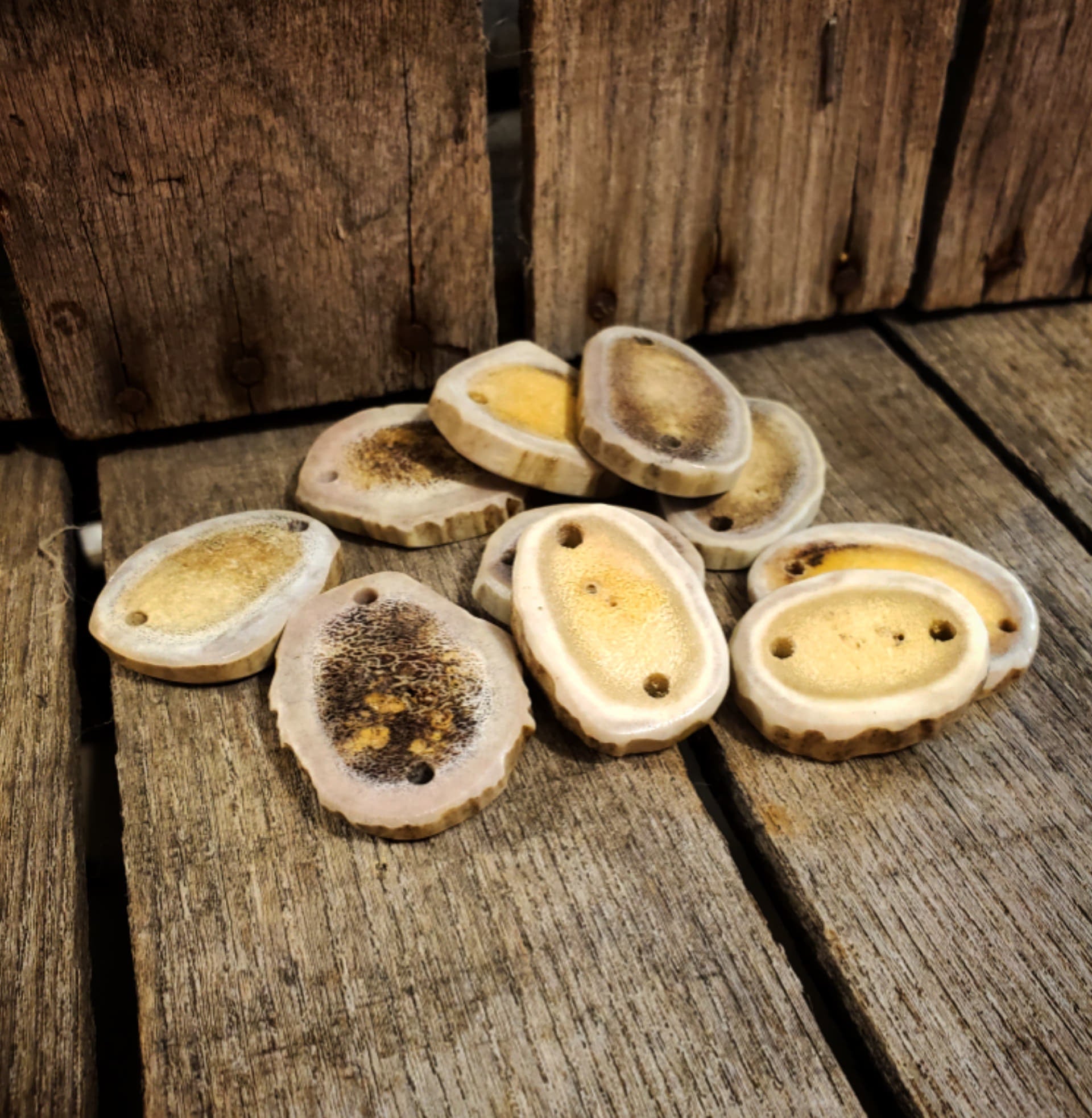 Flat Deer Antler Bracelet Links1-2 inch diameterThese bracelet links are made from all natural shed deer antlers. What is a “shed” antler?Every year, thousands of male Deer, Elk, and Moose across North America grow a new set of antlers. The growth period lasts through the summer months. During this time, the antlers grow with a soft outer shell called "velvet." In the late summer and early fall, the velvet is removed and exposes the hard antler underneath. Later, in the months of January and February, each animals antlers fall off their head. This is the process called "shedding" and is necessary for the animals to be able to grow new antlers throughout the next summer. These "shed" antlers are then left lying on the forest floor, in meadows, creek beds, and on the sides of mountains. Outdoor enthusiasts all over North America lace up their hiking shoes and cover miles of terrain in search of these naturally shed antlers. Once they find them, they can then be sold to be made into dog chews, beads, buttons, furniture, chandeliers and so much more. All of our antler products at Crooked Creek Antlers Inc. are created using these beautiful, all-natural “shed” antlers.