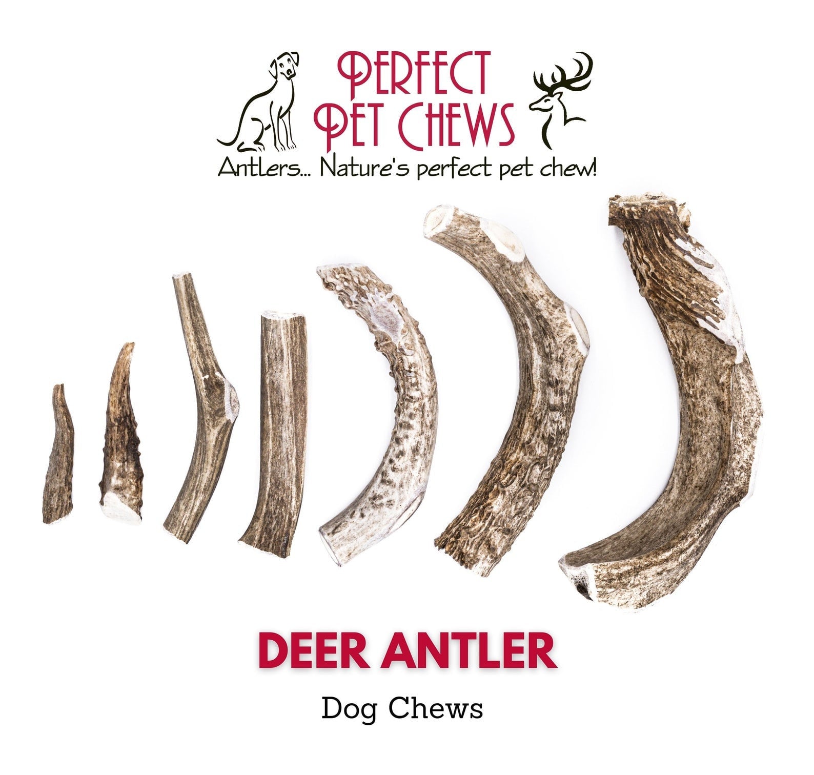 Length- 7-10 inches Weight- 3.5-7 ounces Dog Weight- 40-70 lbs The Perfect Pet Chews ProcessThe FallAll across the United States, thousands of deer, elk, and moose roam free in the wild. From the plains of the Midwest to the great pine forests of the Rocky Mountains these animals can be seen in all of their beauty. The majesty of a large Whitetail Buck, Bull Elk or Moose is truly a wonderful sight to see with their mighty antlers towering over their head. Each year, throughout the spring and summer, these male animals grow a new set of antlers after a natural process called “shedding.” When this happens in the late winter, the animal’s antlers fall off their head leaving the previous year’s “sheds” lying on the forest floor. The FindOnce it is clear the shedding season is over, thousands of hunters and conservationists lace up their hiking boots to walk the fields and forests in search of the treasured “shed” antler. These shed hunters cover miles and miles of North American terrain in order to find theses antlers. After they have been found, shed hunters either keep or sell their forest finds. Many of the antlers can be used to make all-natural, healthy treats for our four-legged friends. From Field to Furry FriendPerfect Pet Chews are made entirely out of those same shed antlers found right here in the United States. We cut, sand, inspect, and package these natural antlers in our own facility. Our antler dog chews are sure to be a favorite treat for your furry friend. Why antler dog chews? Natural antlers offer many great benefits to dogs. Some of these benefits are… -Promotes Good Dental Hygiene -Packed with nutrients such as Calcium and other minerals -Rich marrow center your dog will love -Healthy alternative to other chews on the market -Keeps your dog from chewing valuables such as shoes, furniture, etc.Perfect Pet Chews are 100% natural. They do not contain dyes, preservatives, or chemical enhancements. Our antlers come from the field straight to your furry friend. It is the perfect process for making Perfect Pet Chews. *As with any consumable product, it is imperative that you supervise your pet while they enjoy their antler. Antler consumption should be gradual. If you feel that they are consuming it too quickly, or that it has become a choking hazard, please discard the antler.NOTE: Because no two antlers are alike, the above product image is representative of the piece you will receive, not the actual item.
