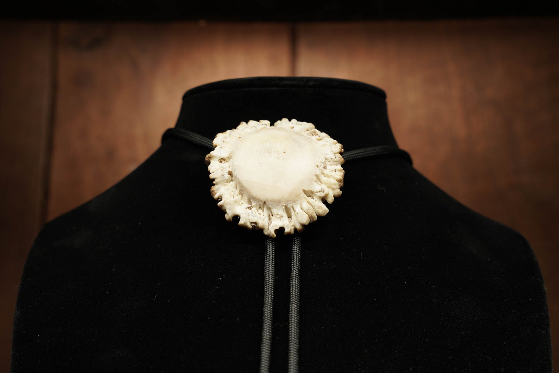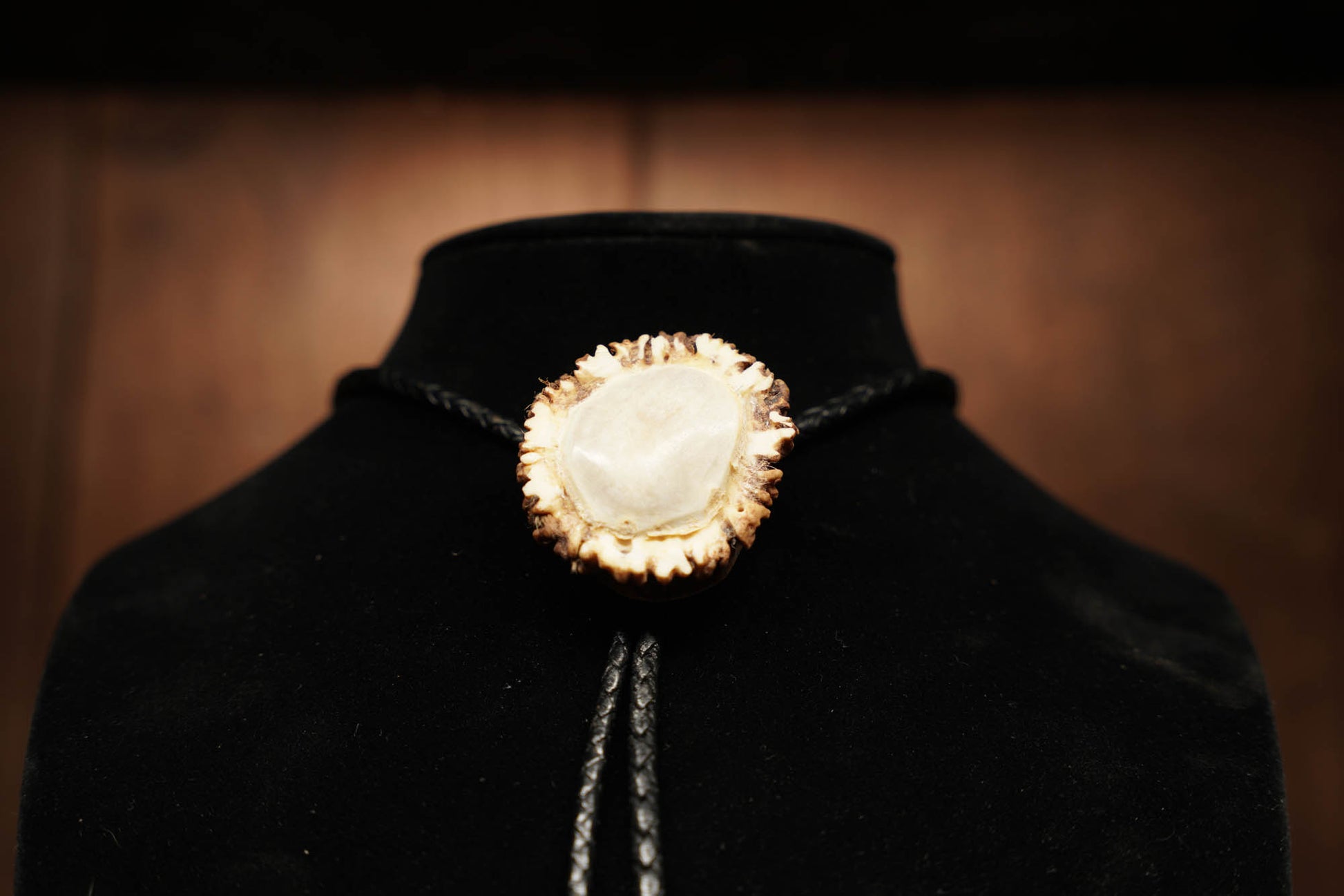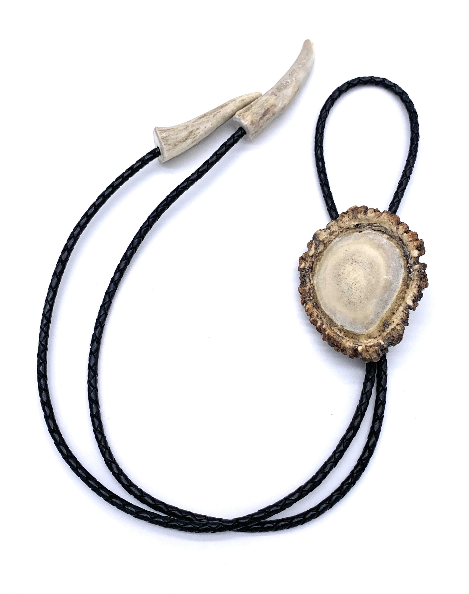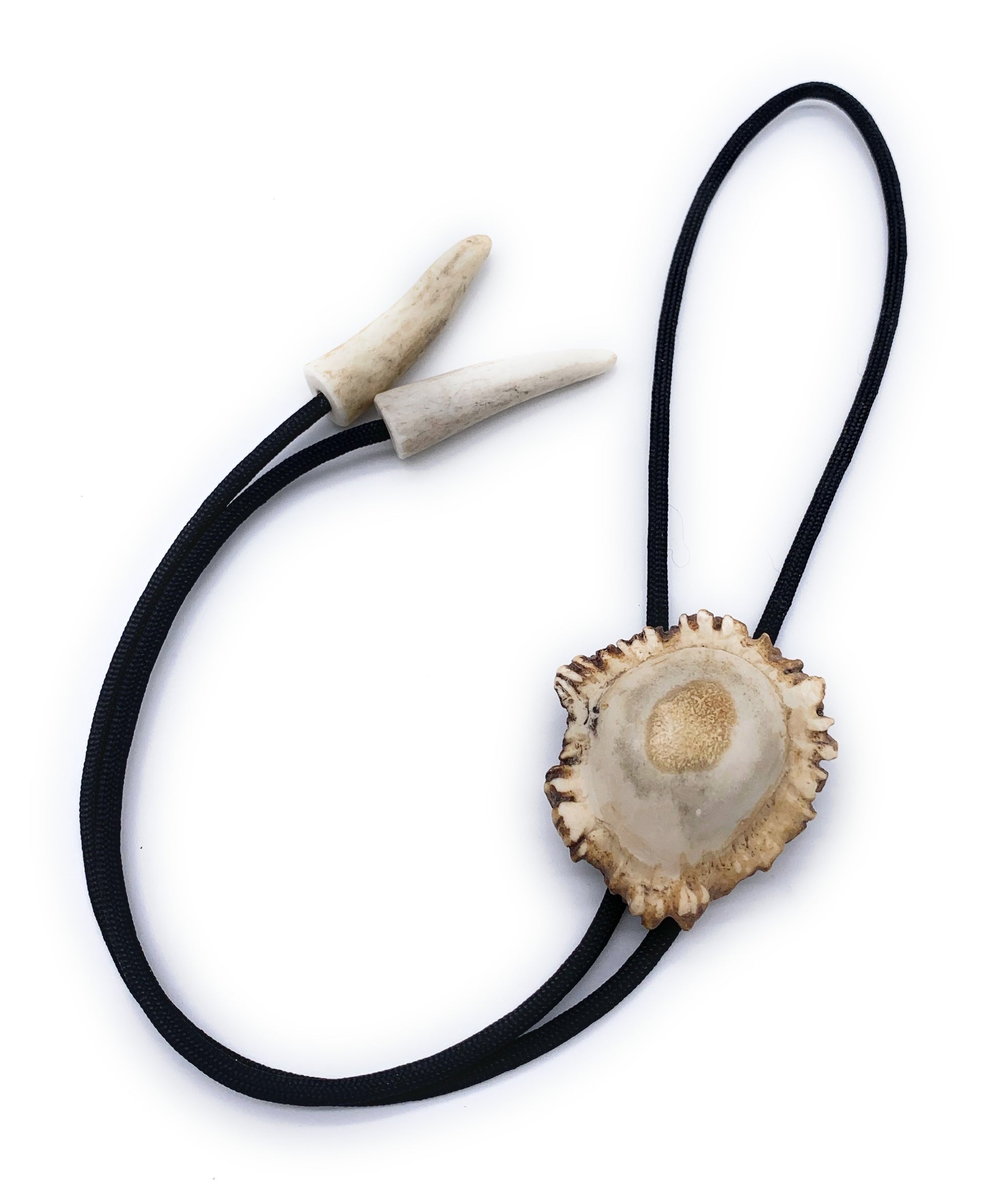 Large Polished Burr Bolo with Antler Tips. Elk burr measures approximately 2" - 2.5" in diameter with 38" of leather.