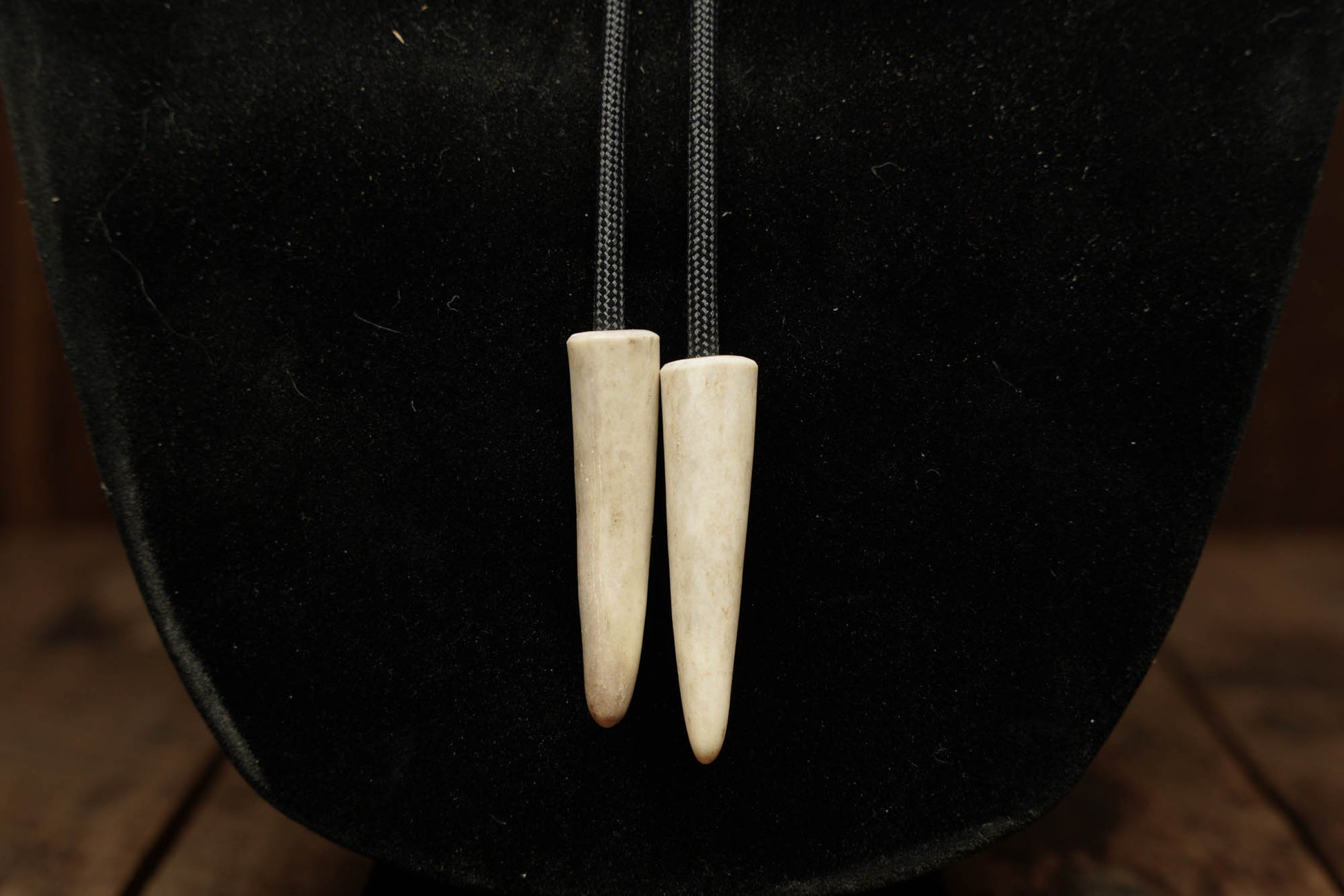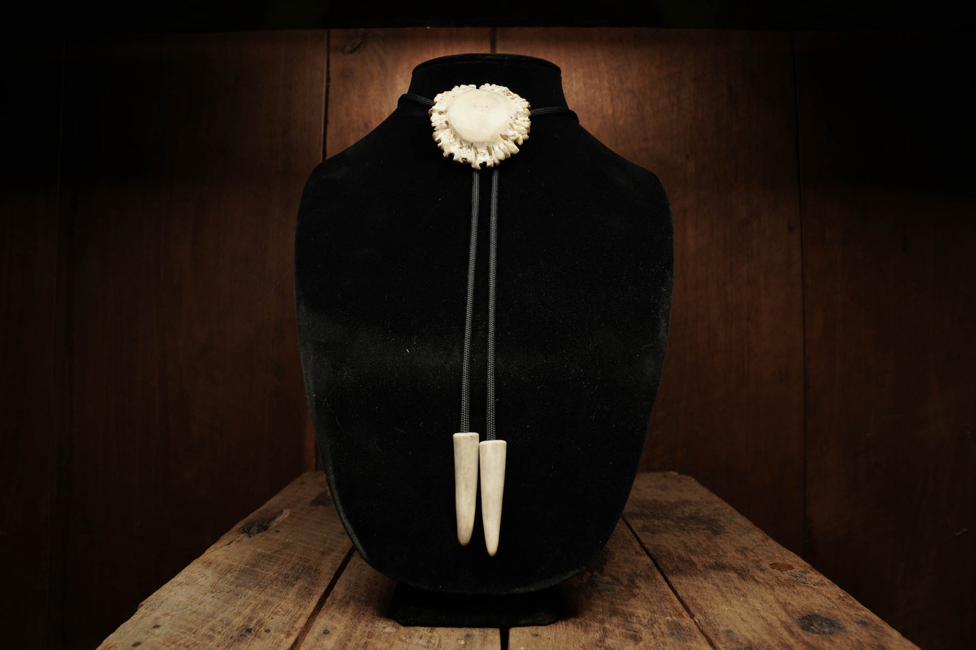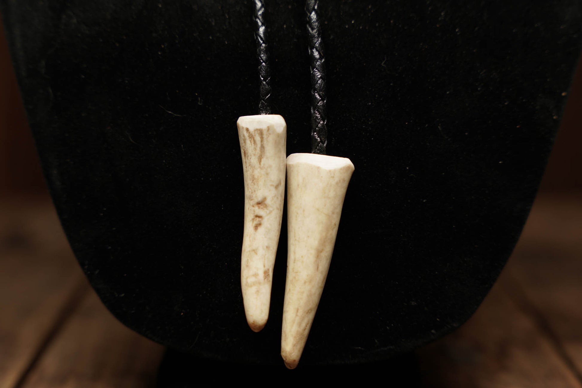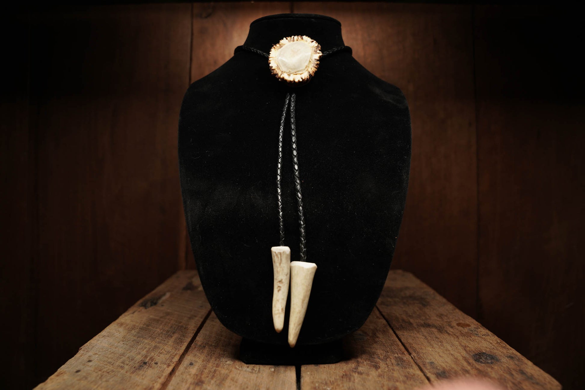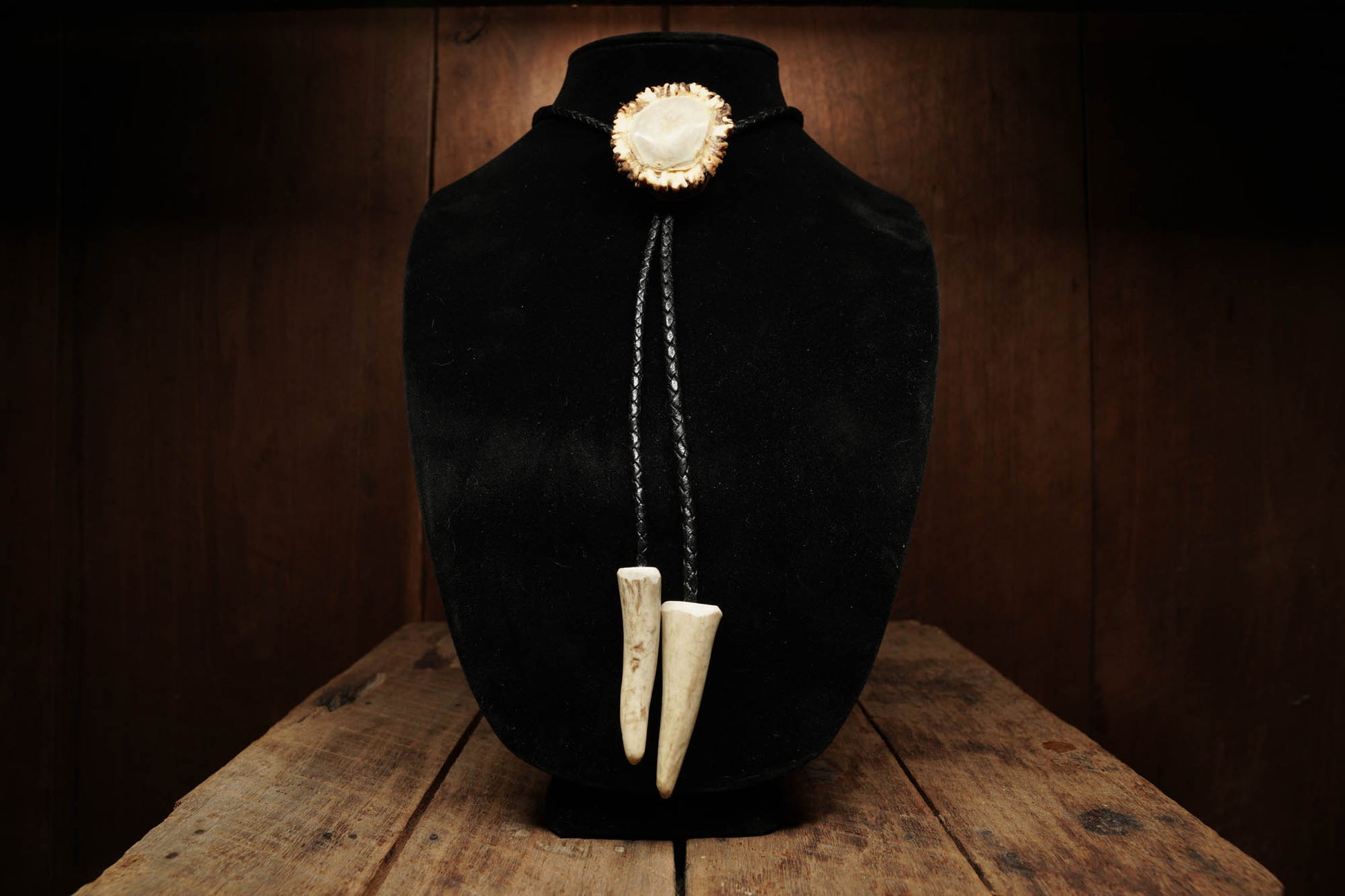 Large Polished Burr Bolo with Antler Tips. Elk burr measures approximately 2" - 2.5" in diameter with 38" of leather.
