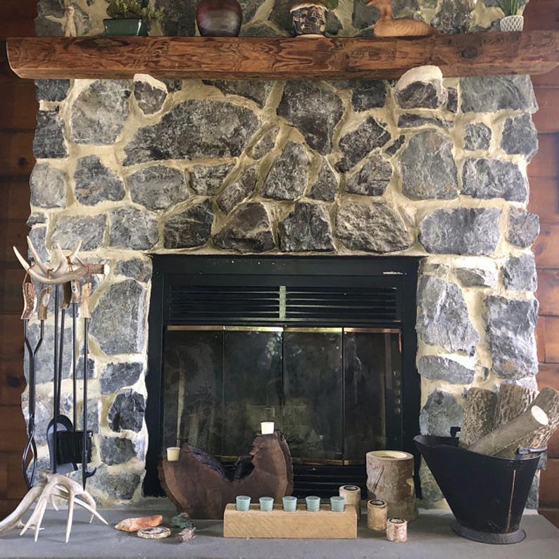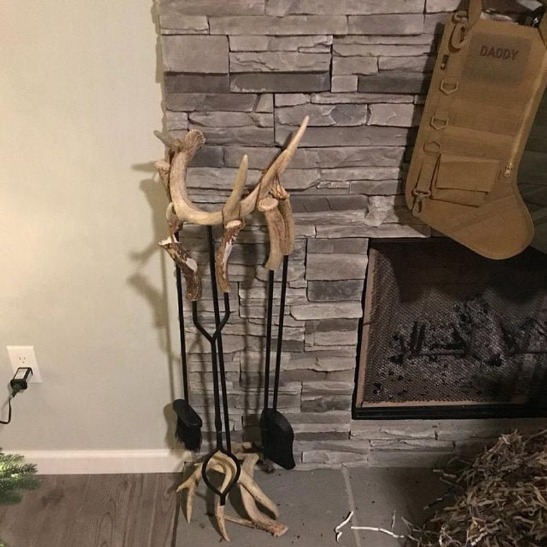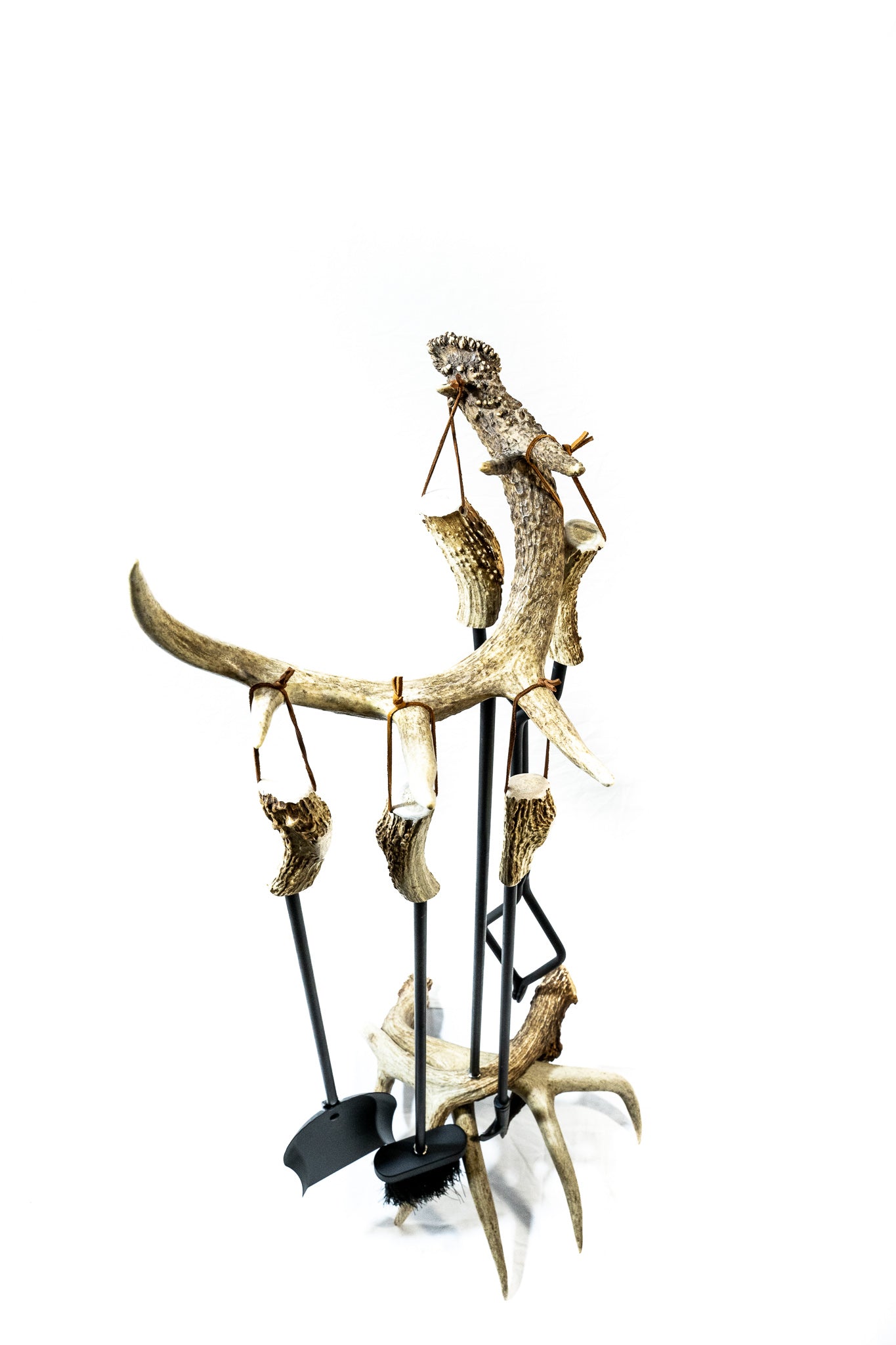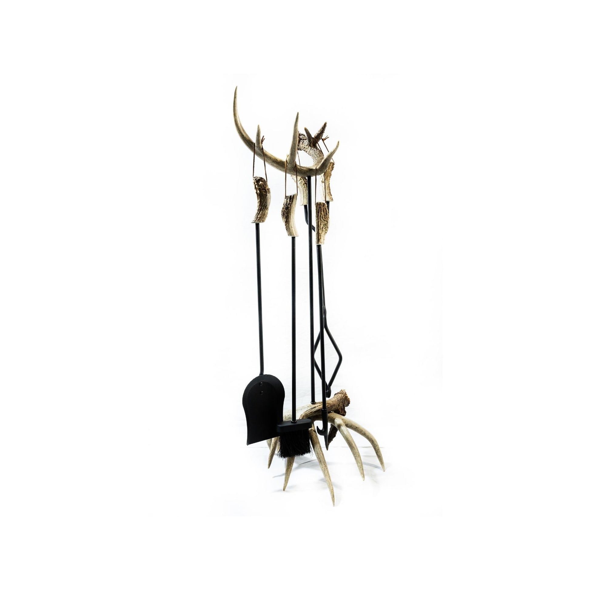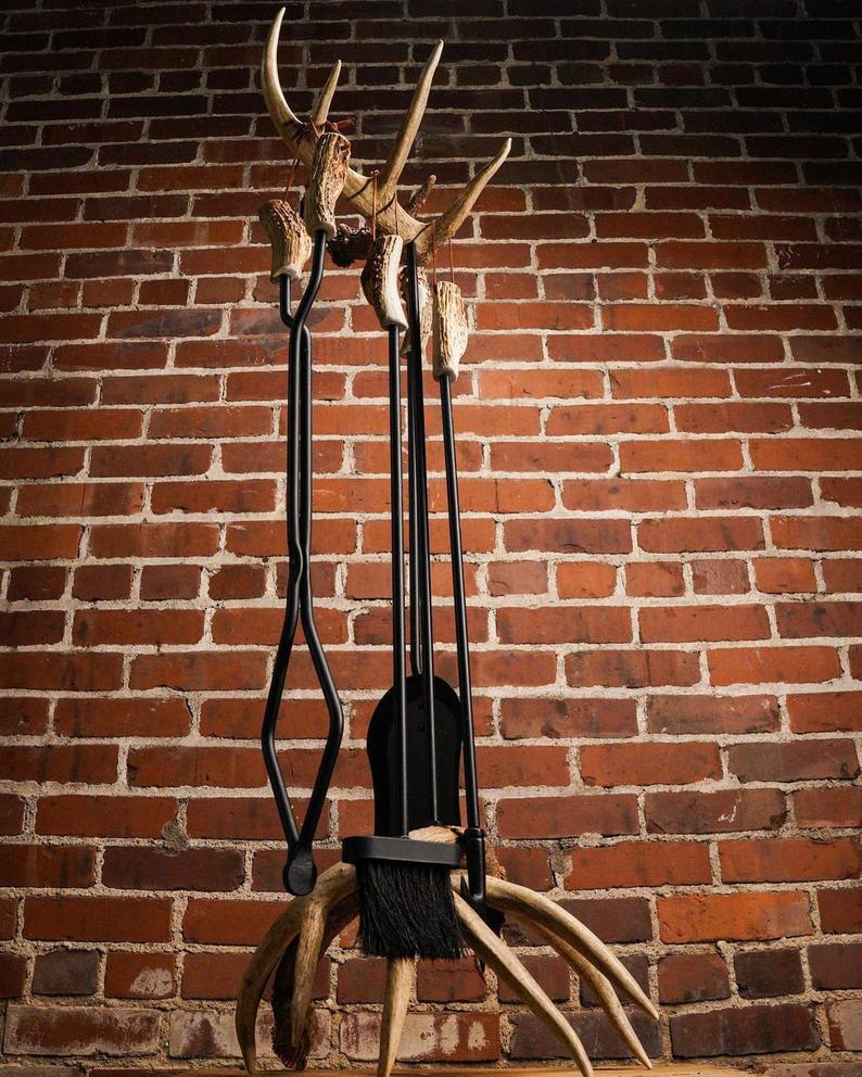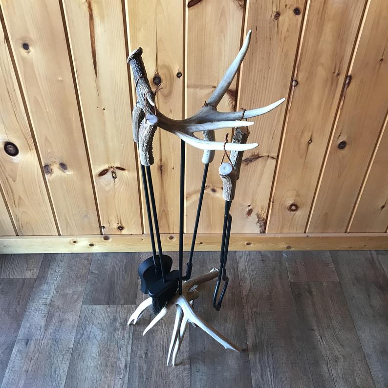 The large whitetail antler fireplace set is constructed using 3 Grade A shed whitetail antlers which are screwed together then patched and colored to blend seamlessly with the natural beauty of the antlers. This set includes four matte black tools: a poker, brush, shovel and tongs each with authentic antler handles.