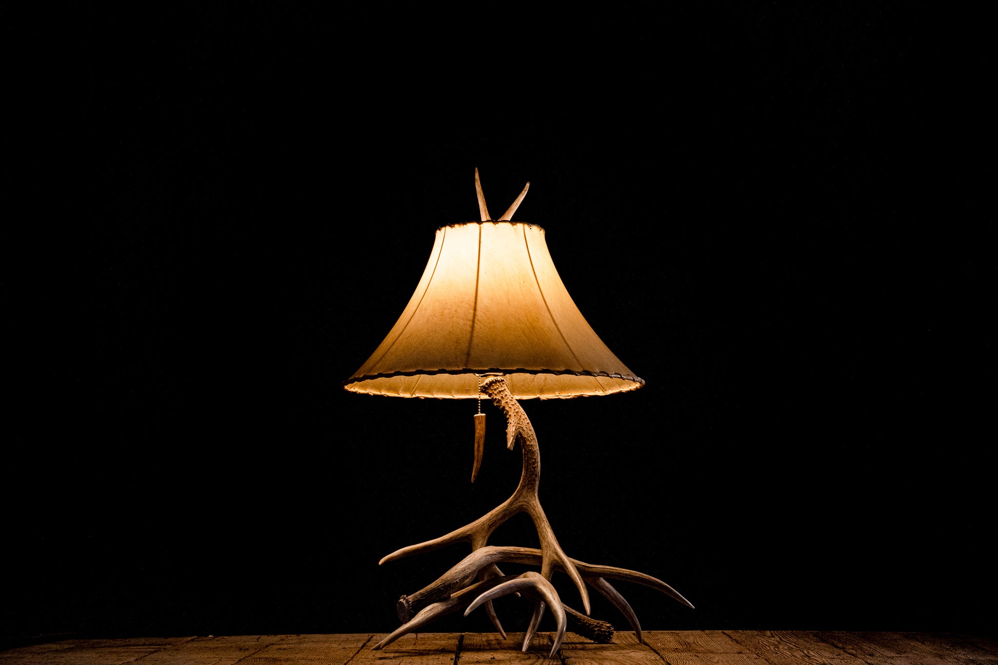 Our medium 3-4 mule deer antler table lamp is constructed using 3-4 Grade A shed mule deer antlers and measures approximately 24-28" tall with a base of 15-18". This lamp comes with an antler finial and pull chain. Wiring is inside the antler and the antlers are screwed together. All screw holes are patched and colored to blend seamlessly with the natural beauty of the antlers.