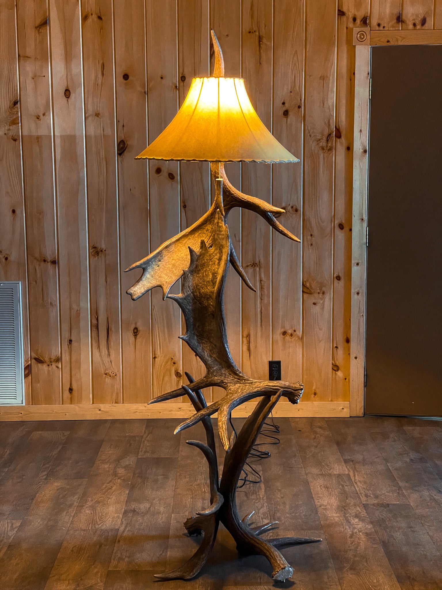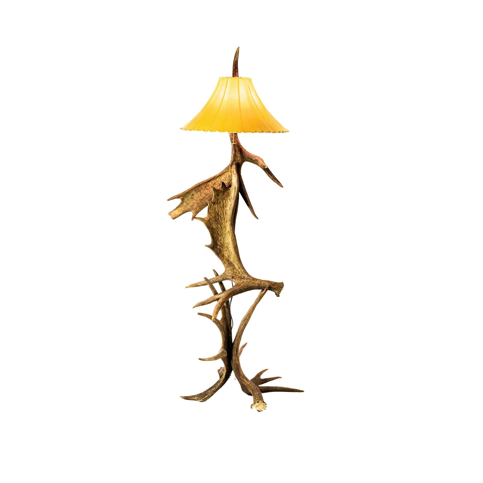 Our Moose Antler floor lamp is constructed using 3-5 Grade A shed moose antlers and measures approximately 65-72" tall with a base of 20”+. This lamp comes with an antler finial and pull chain. Wiring is inside the antler and the antlers are screwed together. All screw holes are patched and colored to blend seamlessly with the natural beauty of the antlers.