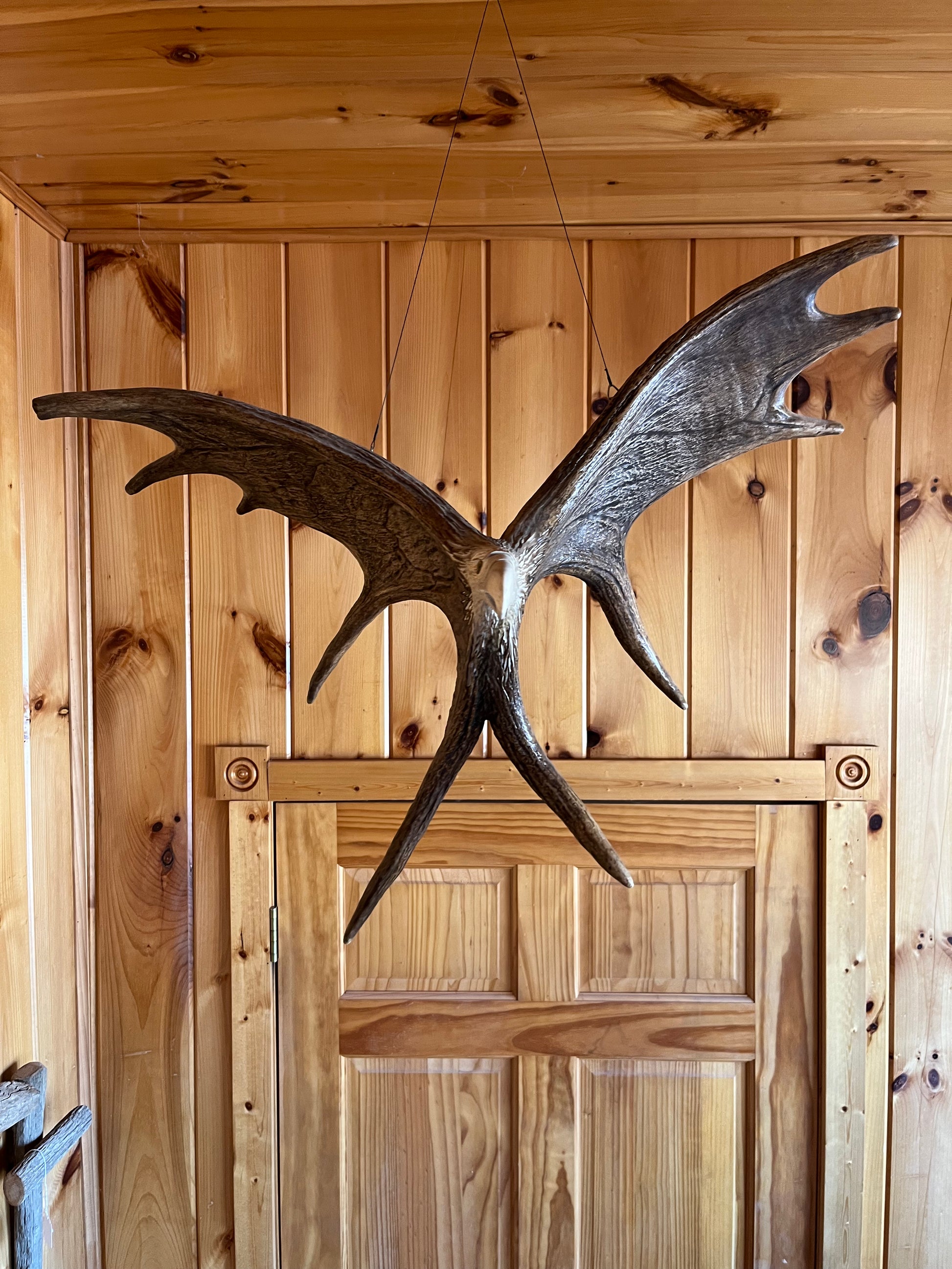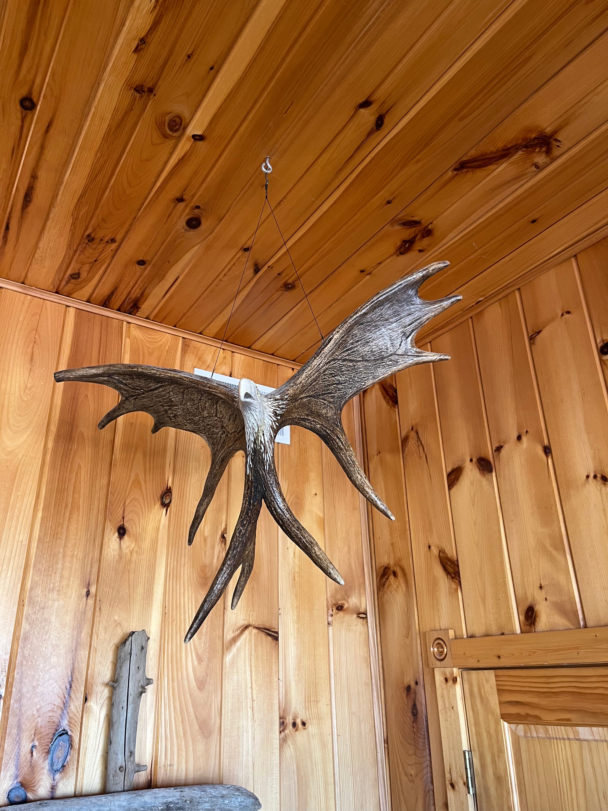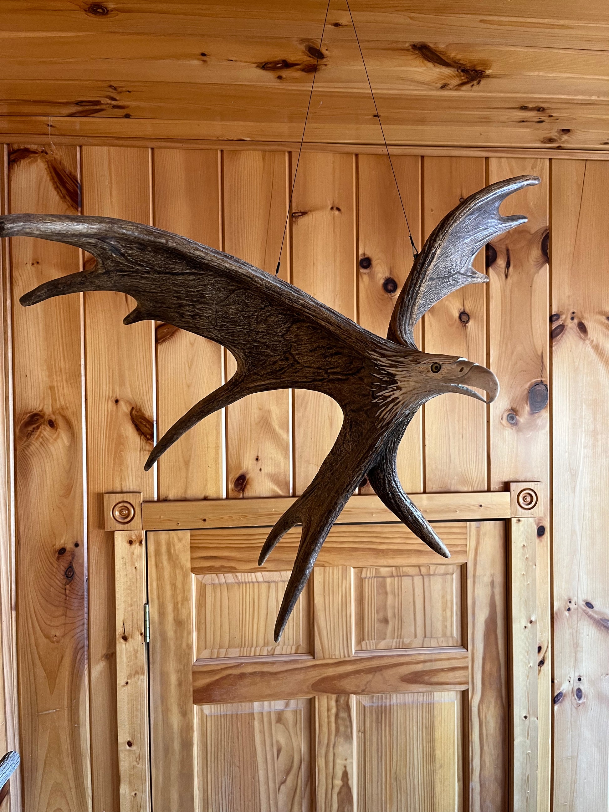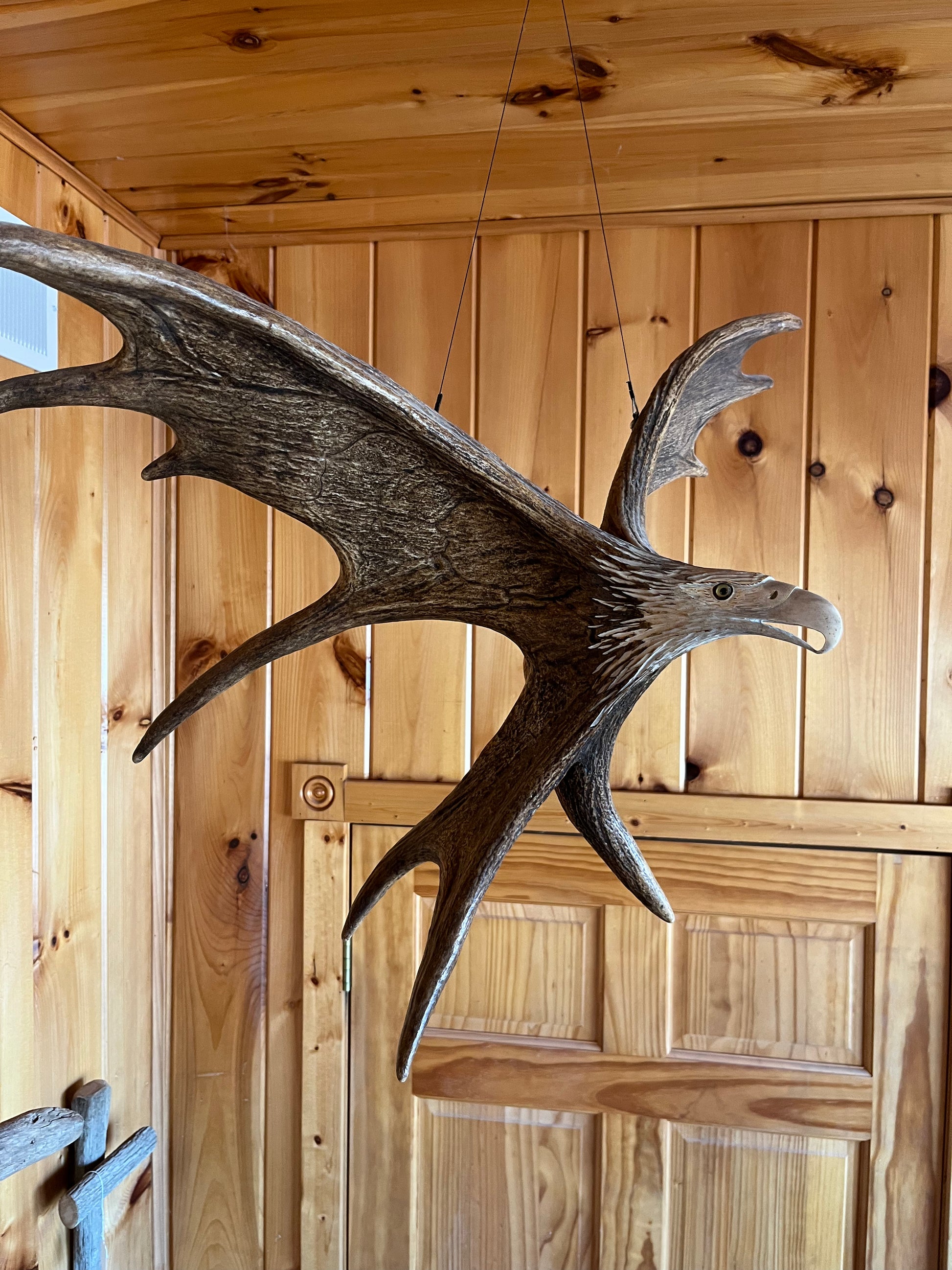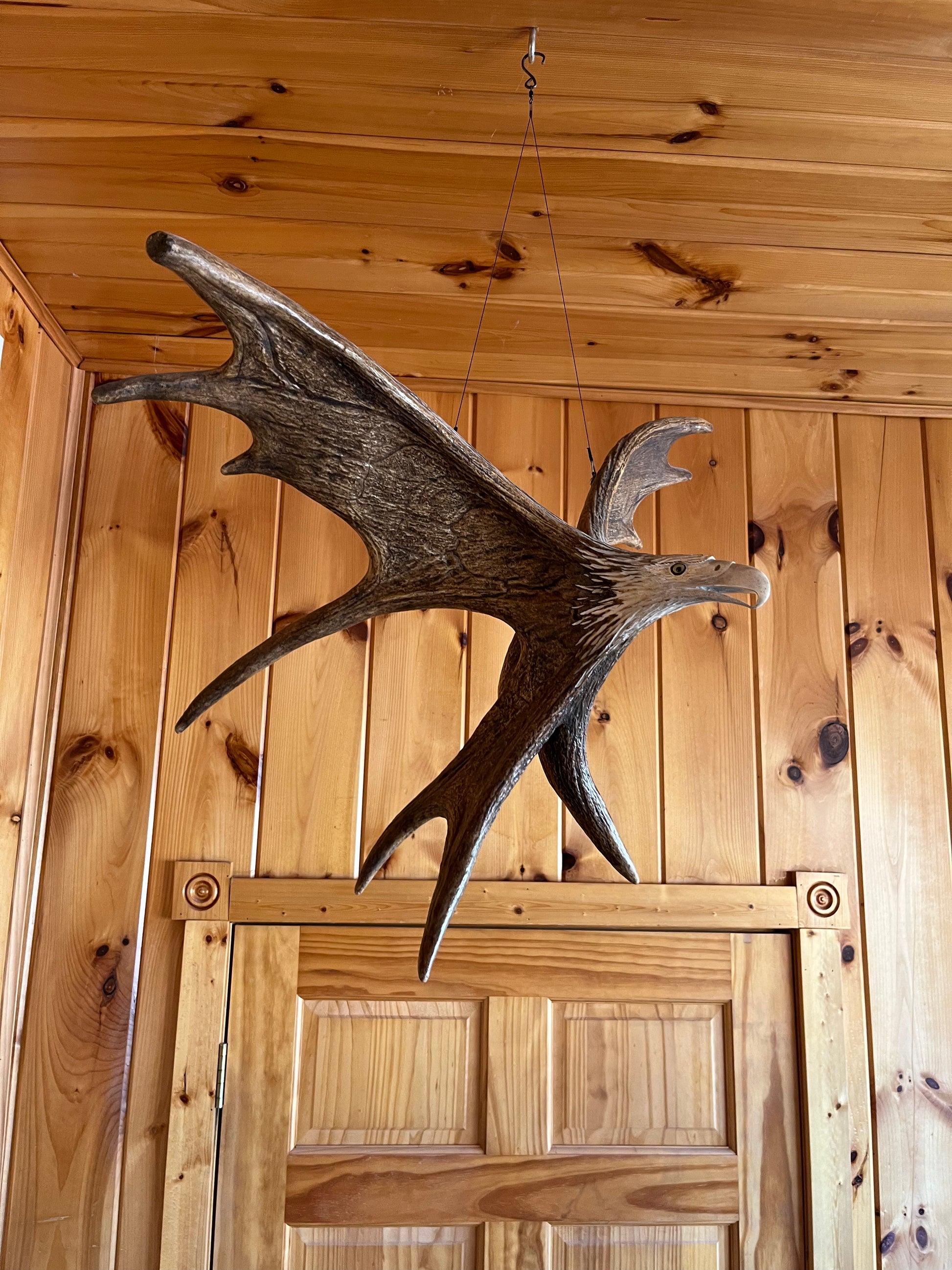 Moose antler hanging eagle carving made using 2 moose antlers carved by David Stencel from Wisconsin. Very unique and professional carving by talented artist.