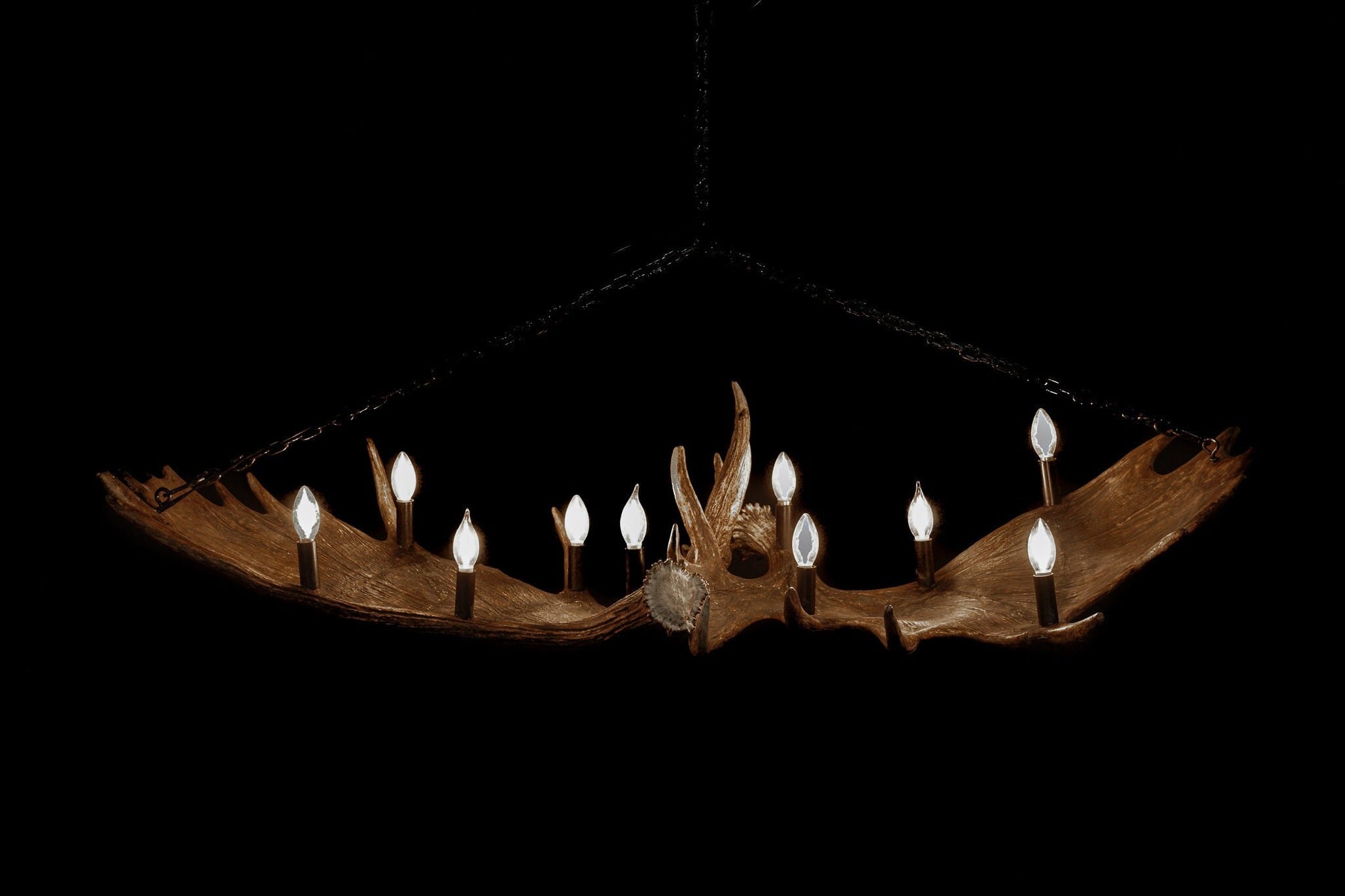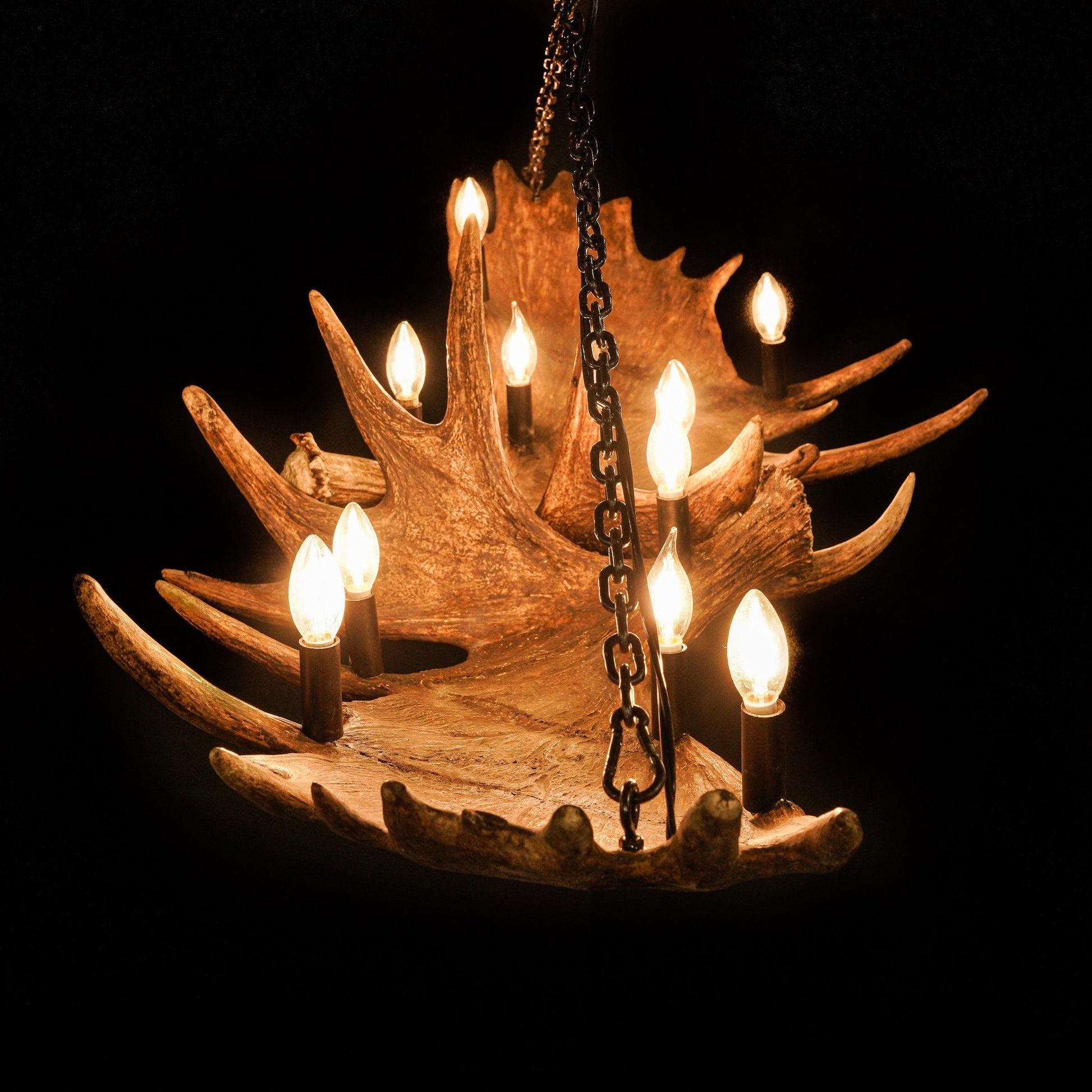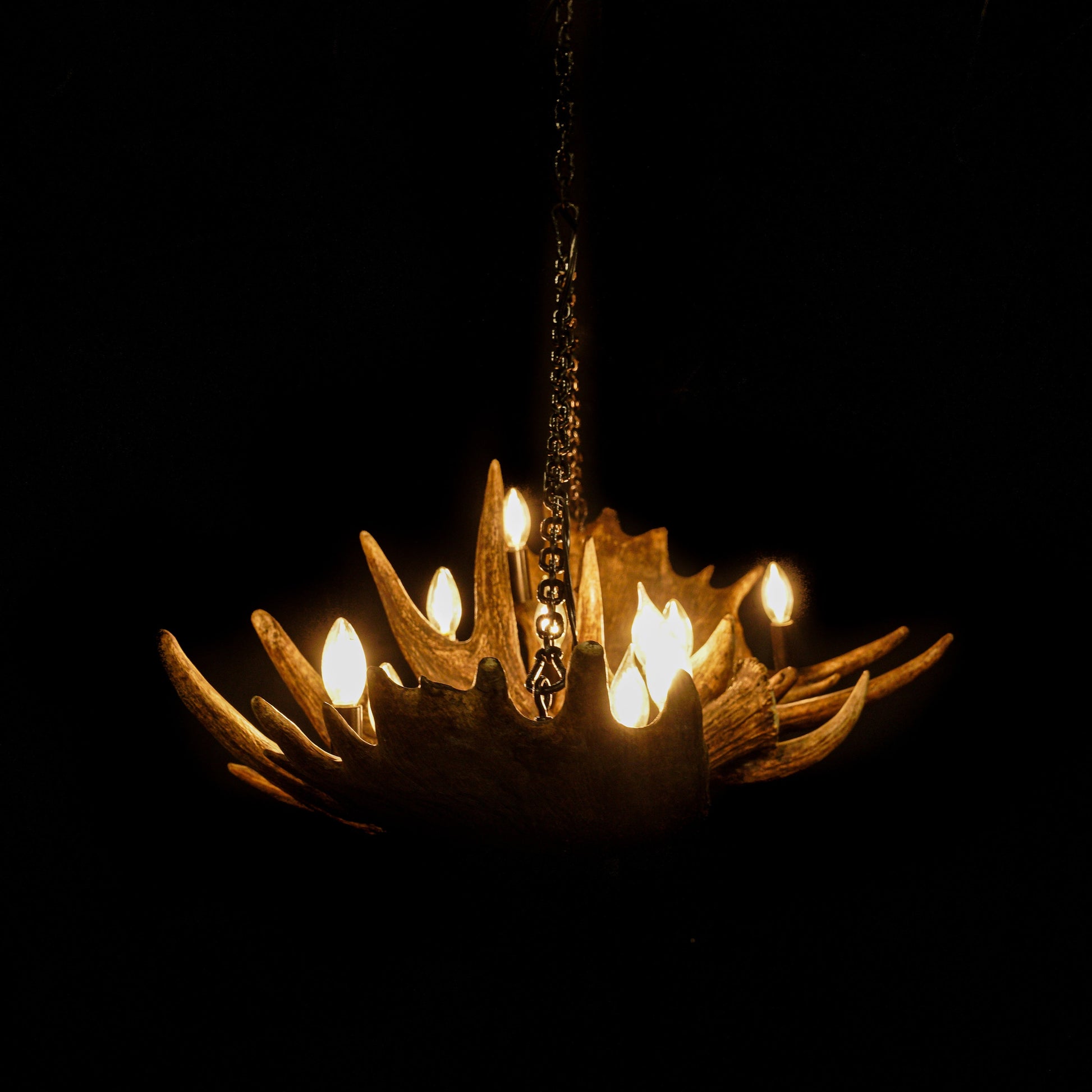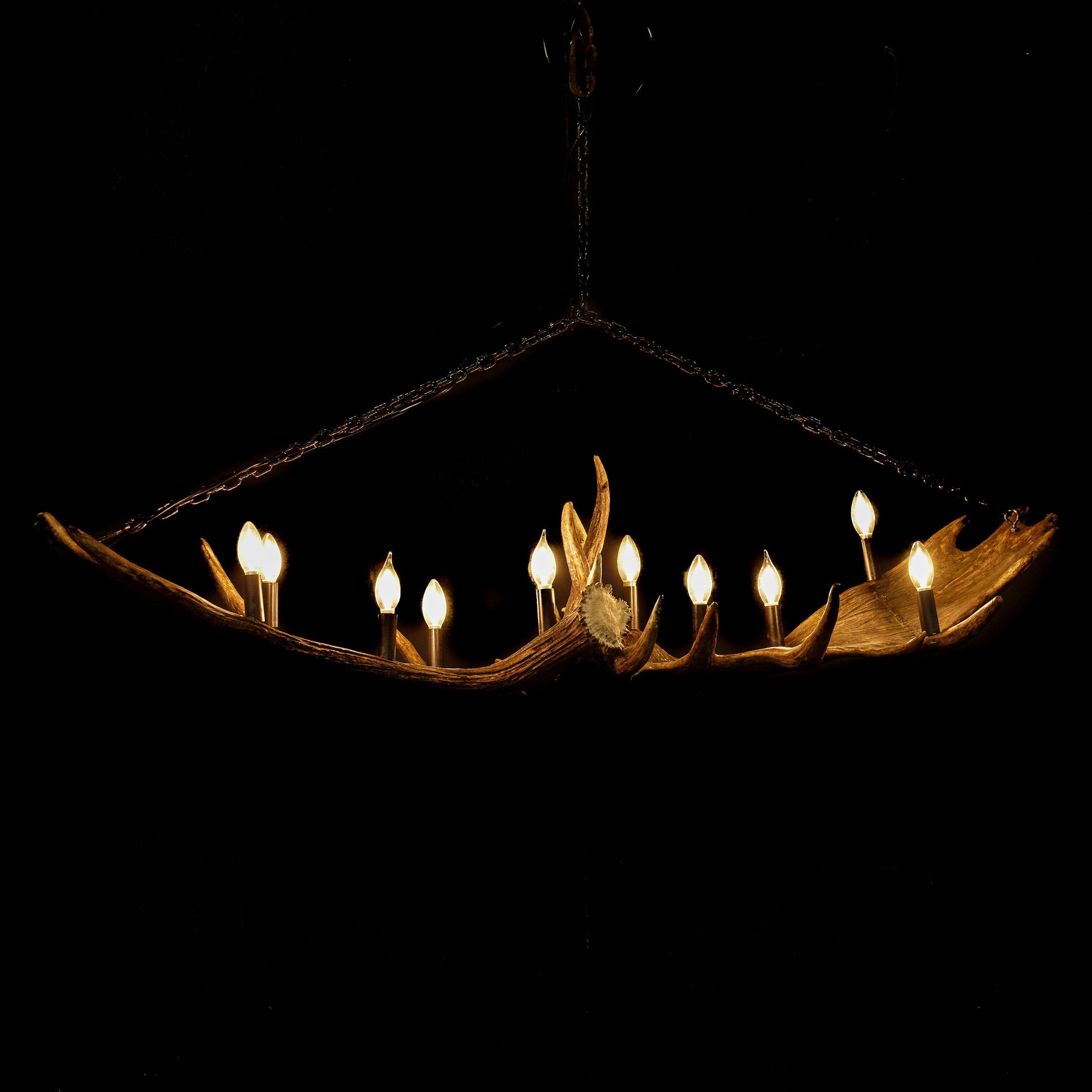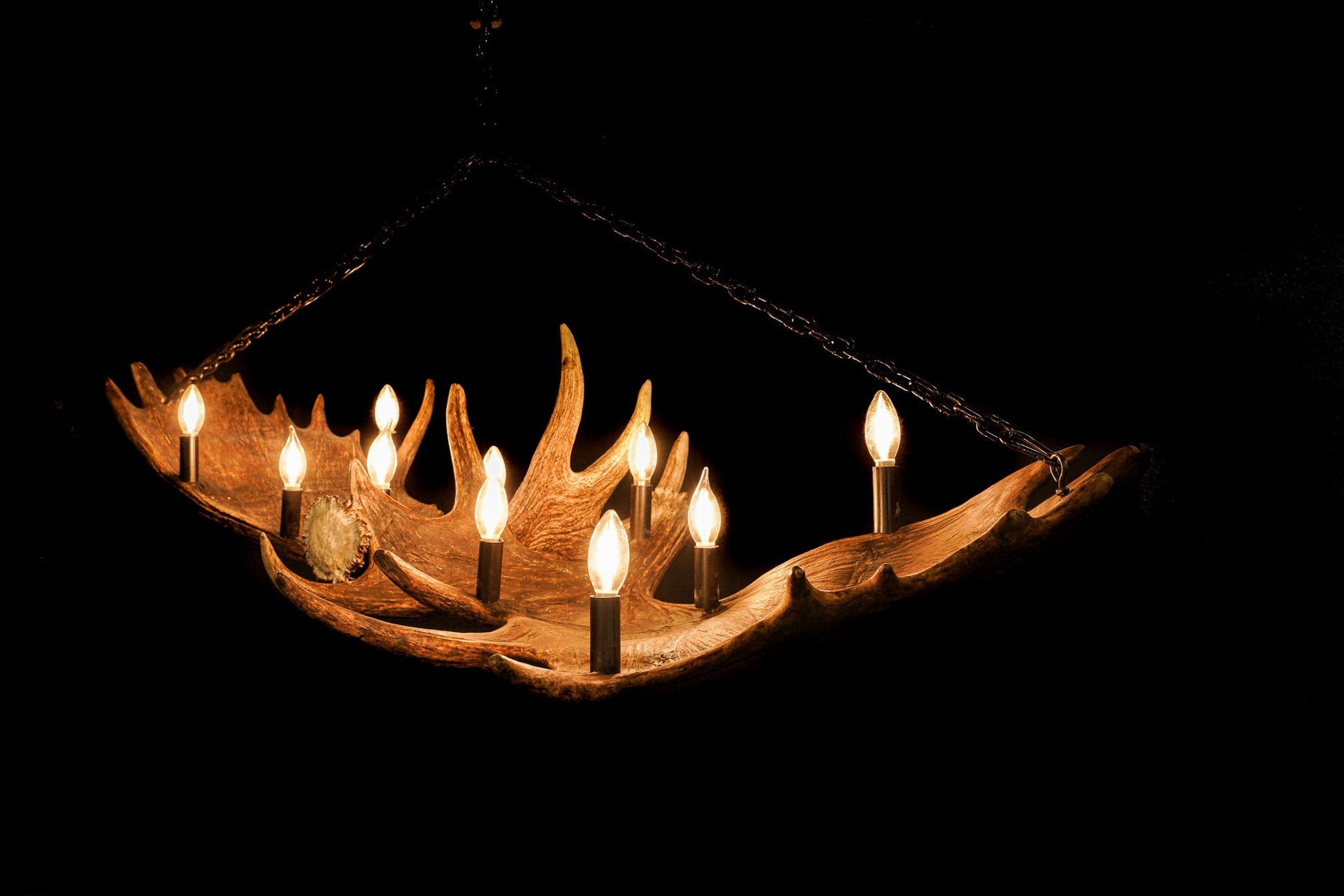 This chandelier is constructed by Crooked Creek Antler Art using real, naturally shed moose paddles. We select two large moose antlers about the same weight and size and place them in an artistic design to form a beautifully crafted oblong shaped antler chandelier. The finished light will be 60"+ long and 20-28" wide.This fixture is made with with 10 candelabra light sockets and all wiring is within the antler. This chandelier comes with chain and hardware for installation. All wiring and sockets are UL approved and high quality Please note all orders for antler chandeliers and products by Crooked Creek Antlers are made to order. Current lead time on a hanging light is 6-8 weeks but this may vary depending on material availability. Please contact us with any custom or special requests. This chandelier will be completed and crated in a heavy duty wooden box that is going to keep your beautiful fixture safe in transit. The cost of this process is included within the listing total price.