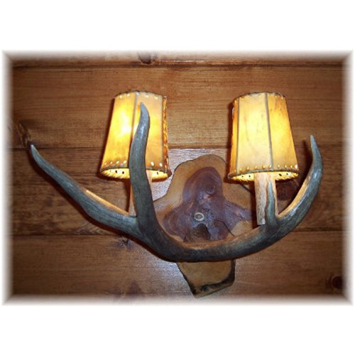 Mule Deer Antler Sconce 2 lights. Measures approx 12" tall and 14-20" wide. Wiring is inside antlers and all parts are ul listed. The socket covers are real antler. When ordering, please specify whether sconce should be corded or hard wired. Please allow 4-6 weeks for delivery.