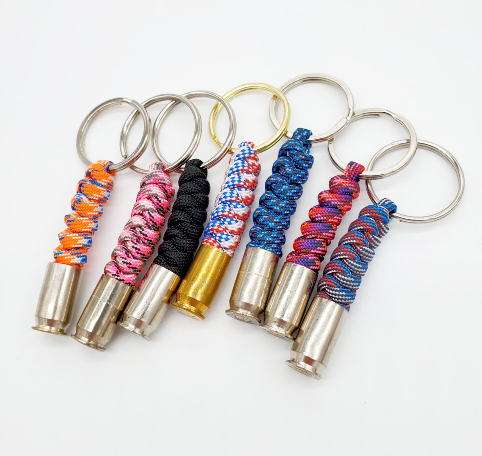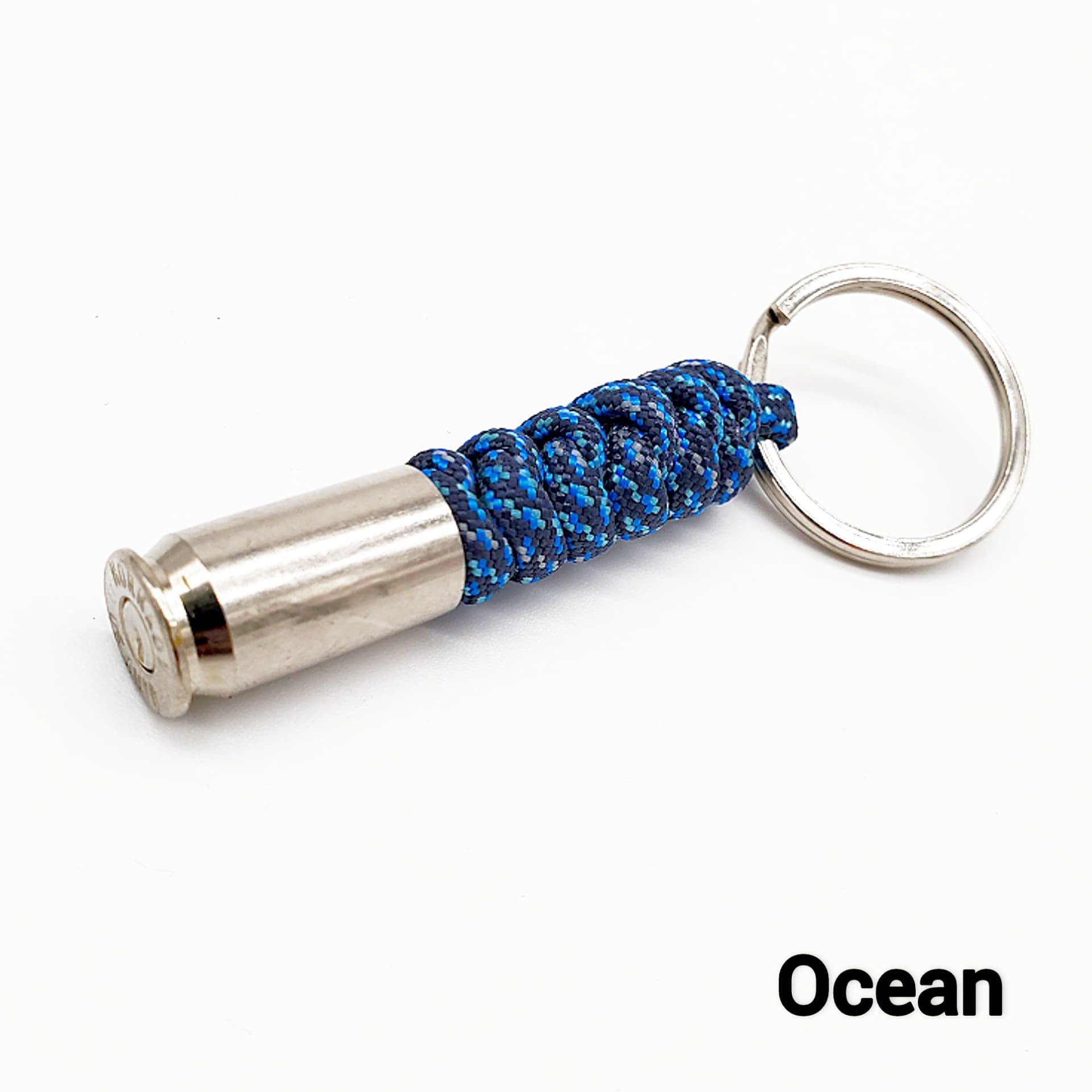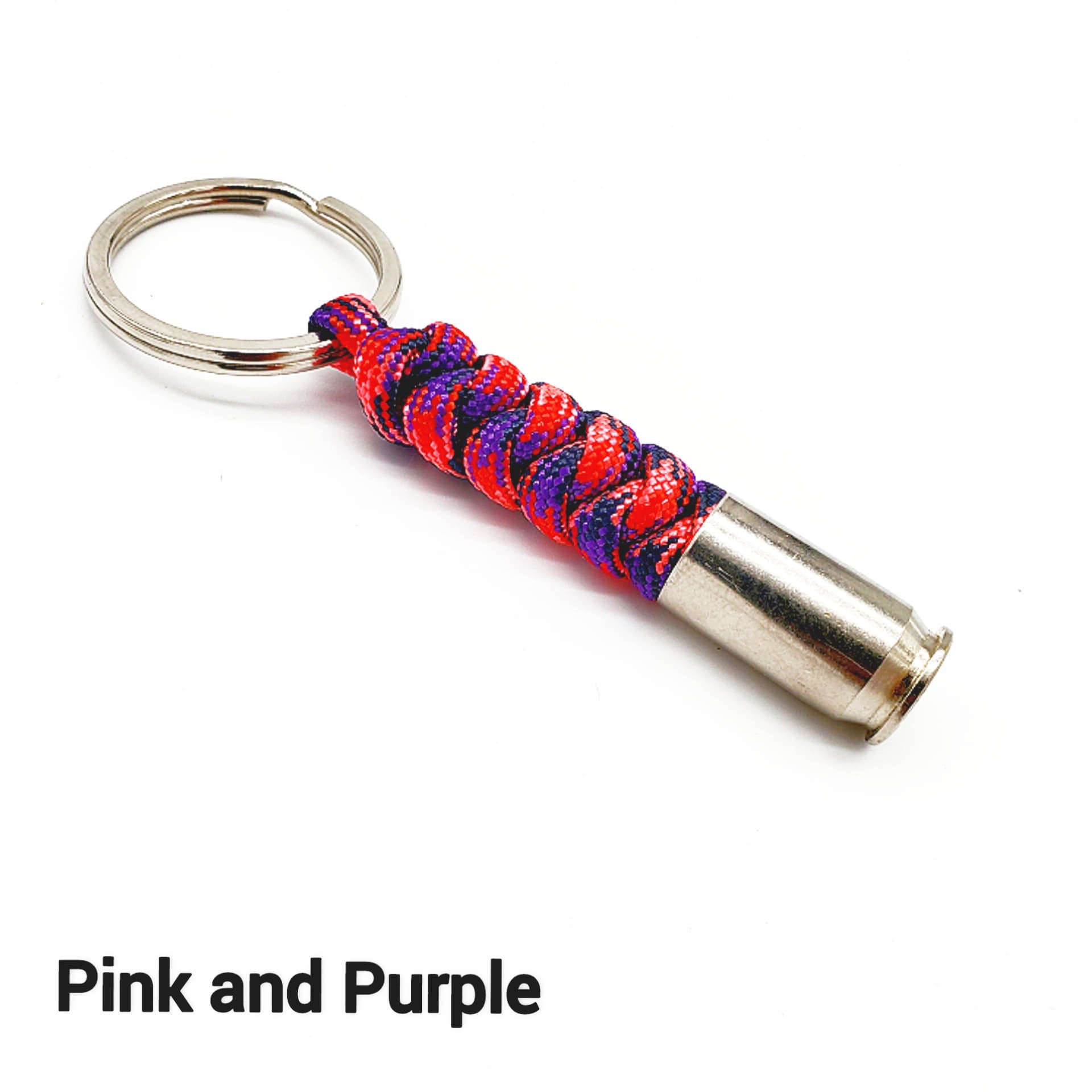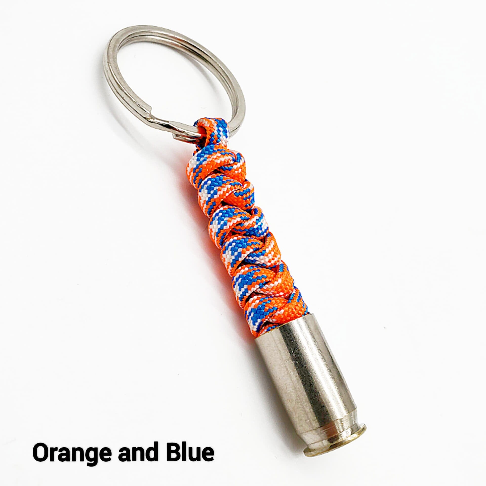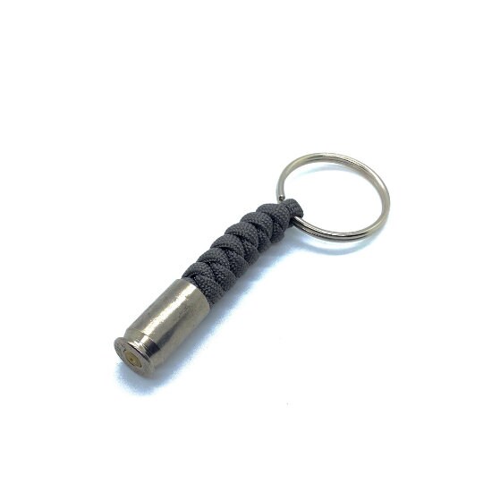 Hand-tied paracord key chain with a spent .45 nickle casing.
