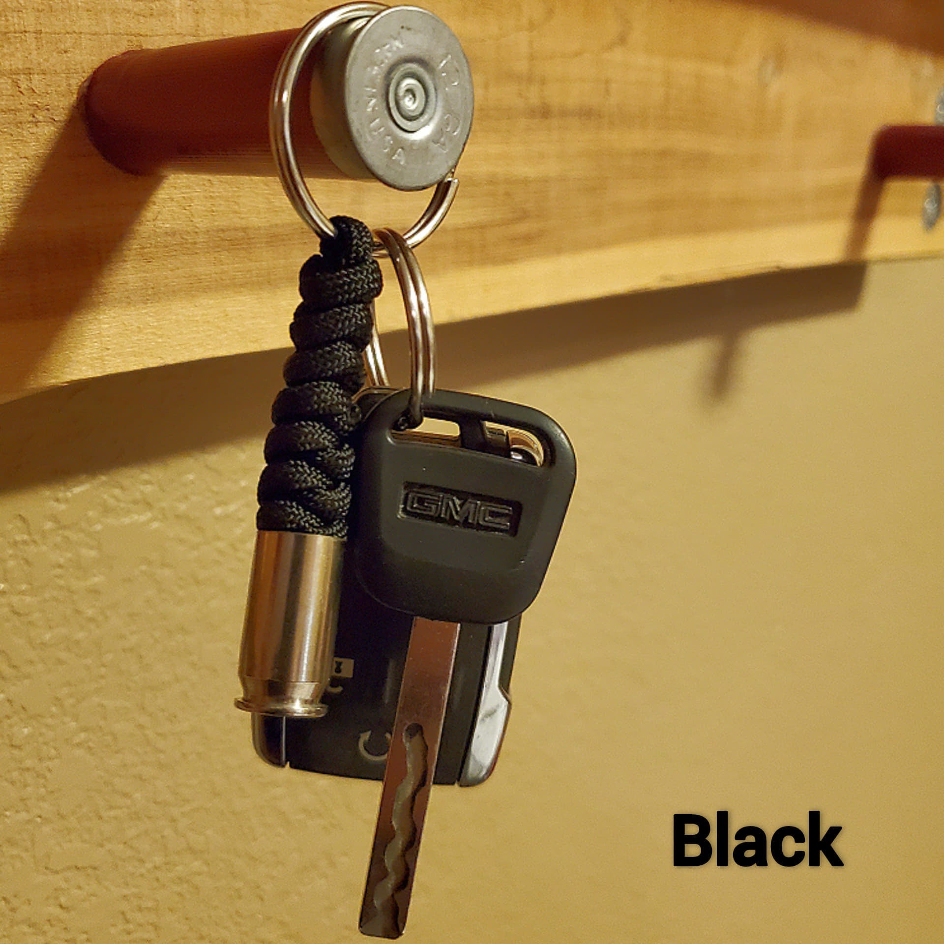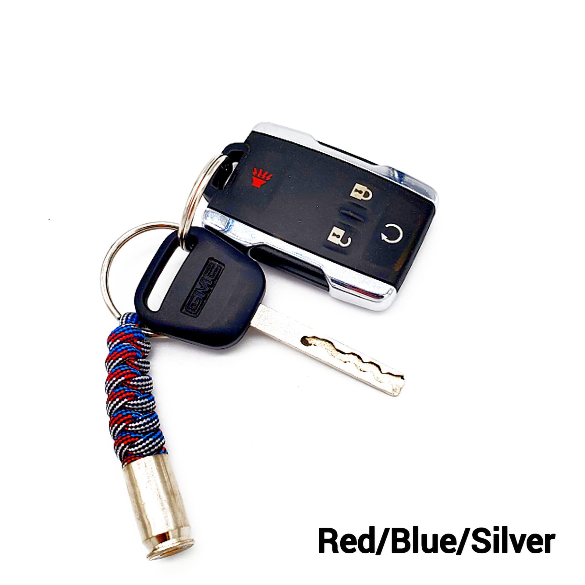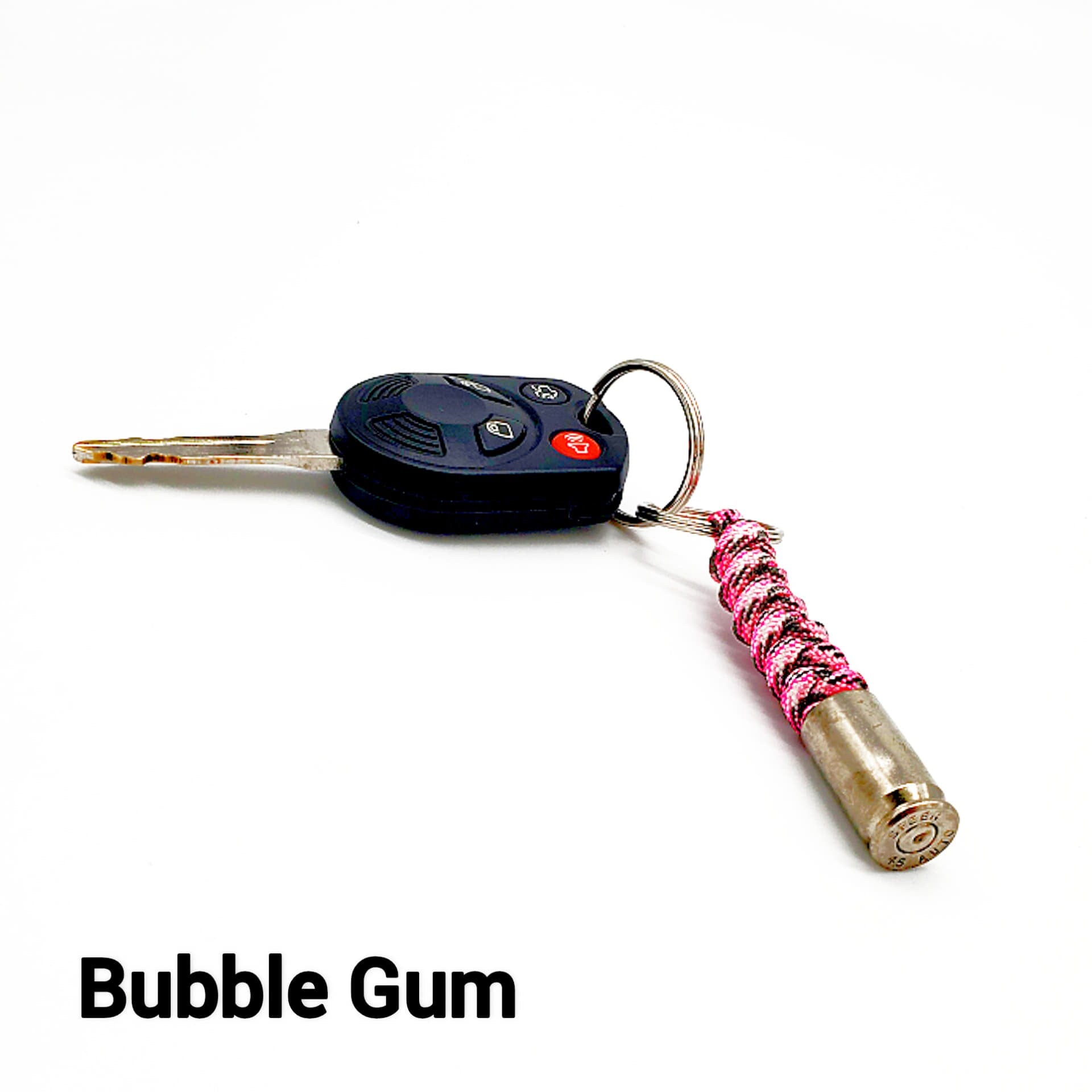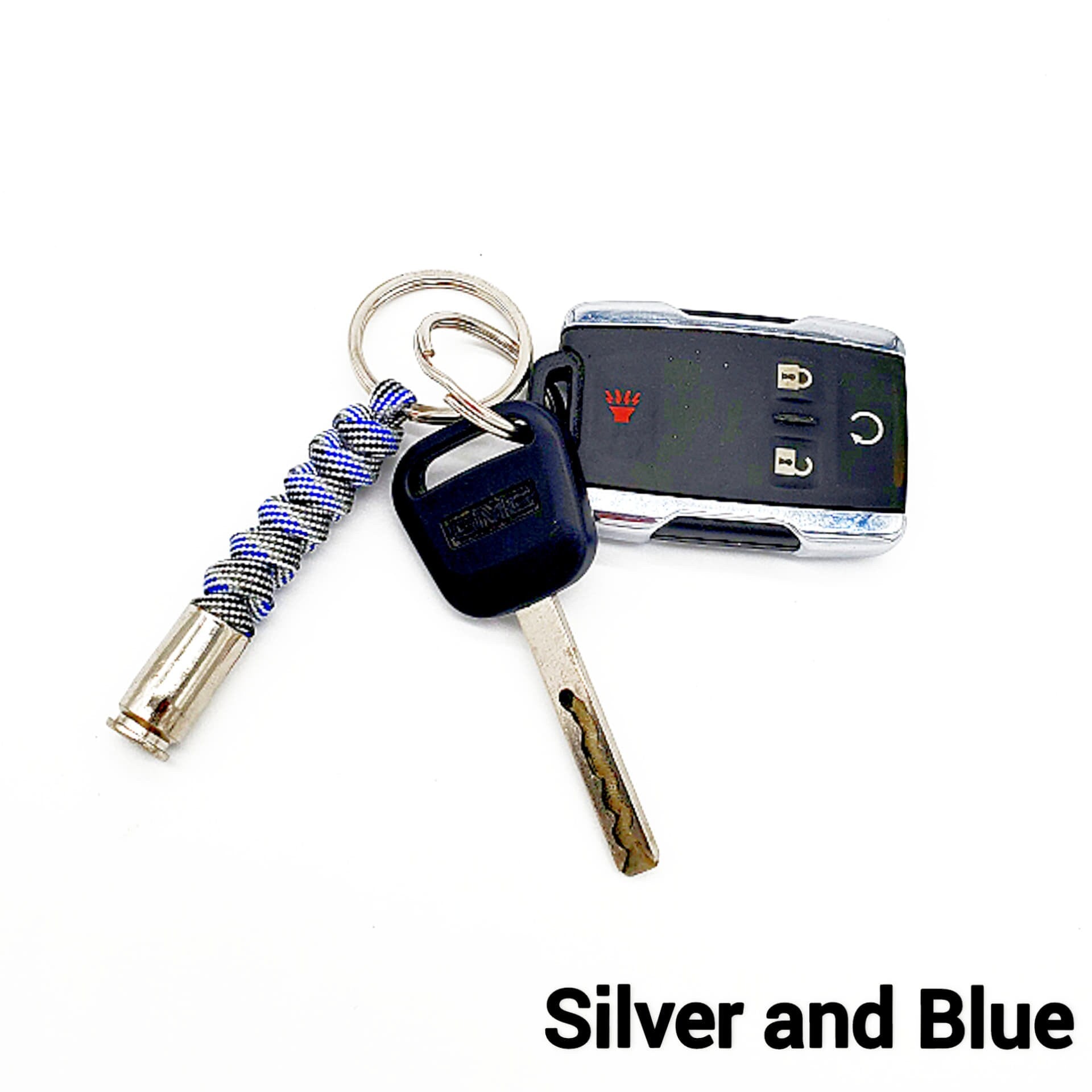 Hand-tied paracord key chain with a spent .45 nickle casing.