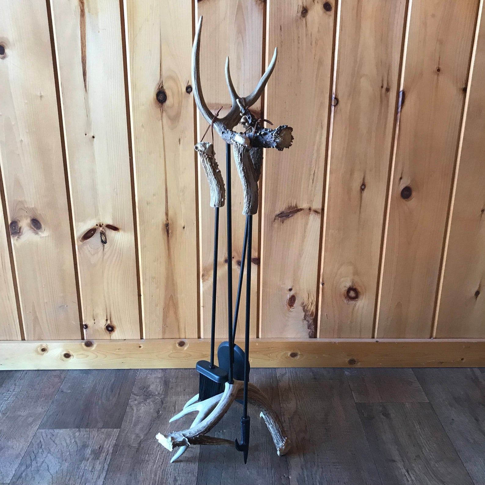 The standard whitetail antler fireplace set is constructed using a Grade A shed whitetail antler. This set includes three matte black tools: a poker, brush and shovel, each with authentic antler handles.
