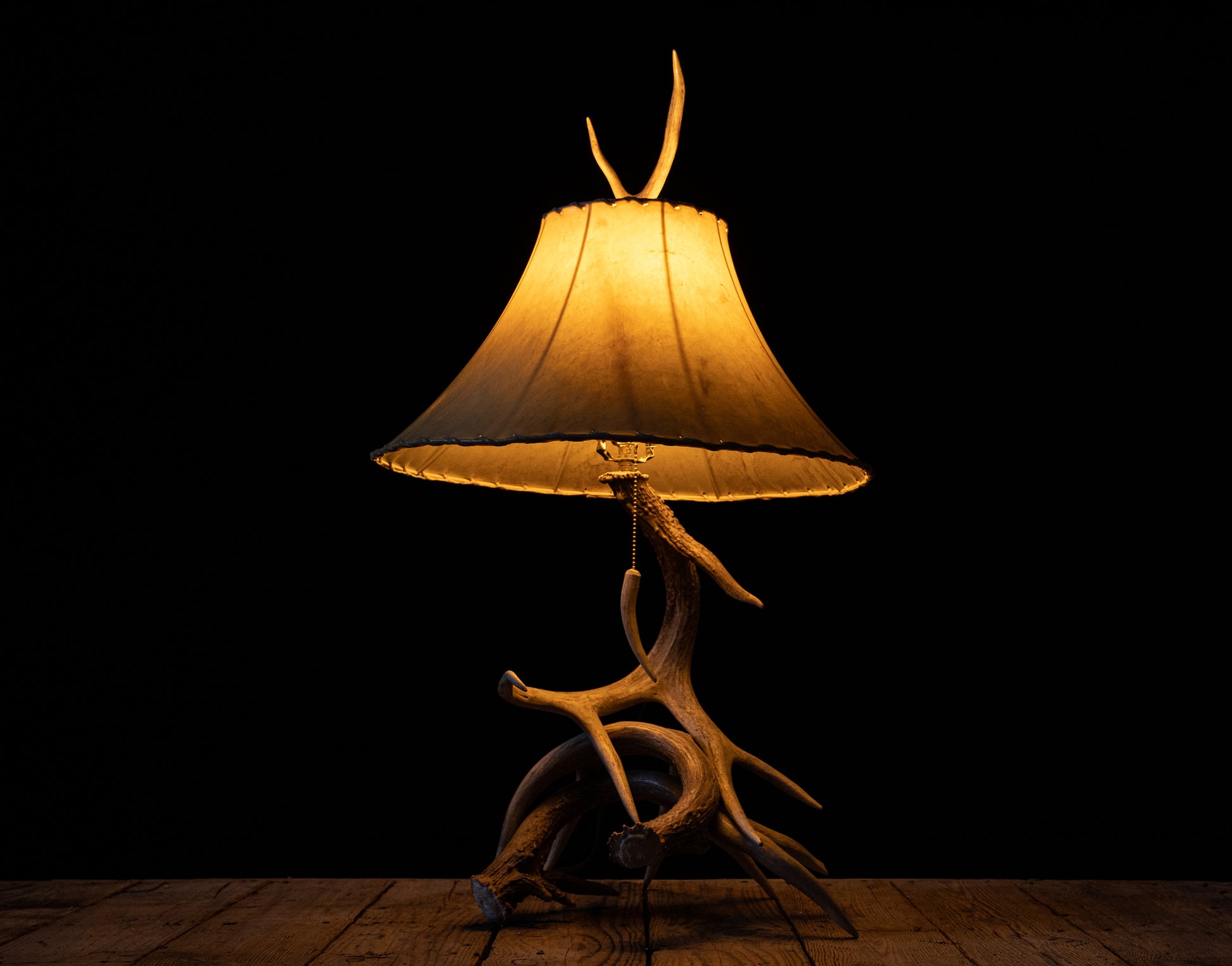 Our trophy whitetail antler table lamp is constructed using 3-4 Grade A shed whitetail antlers and measures approximately 26-30" tall with a base of 14-18". This lamp comes with an antler finial and pull chain. Wiring is inside the antler and the antlers are screwed together. All screw holes are patched and colored to blend seamlessly with the natural beauty of the antlers.