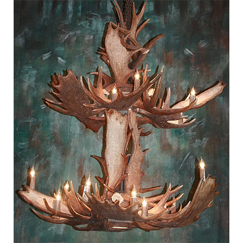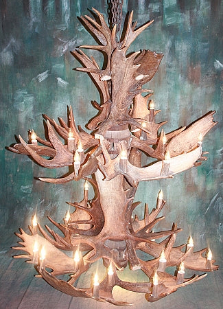 Our Two Tier Moose Antler Chandelier is made using 21 moose antlers and wagon wheel hubs and has 30 lights. This chandelier measures approx 60"+ diameter and 60" plus tall. Wiring is all inside the antlers and we use only UL listed parts. While most chandeliers adapt well to shades, rawhide shades are not included unless noted on the initial order.