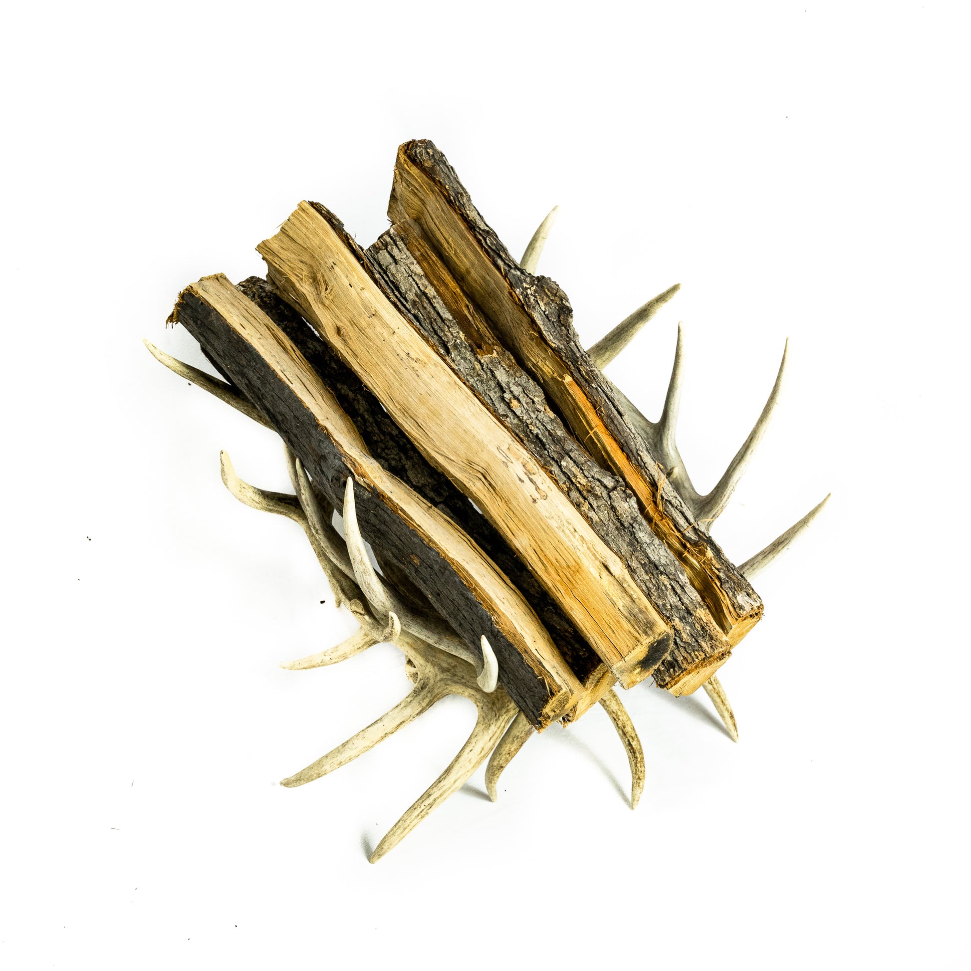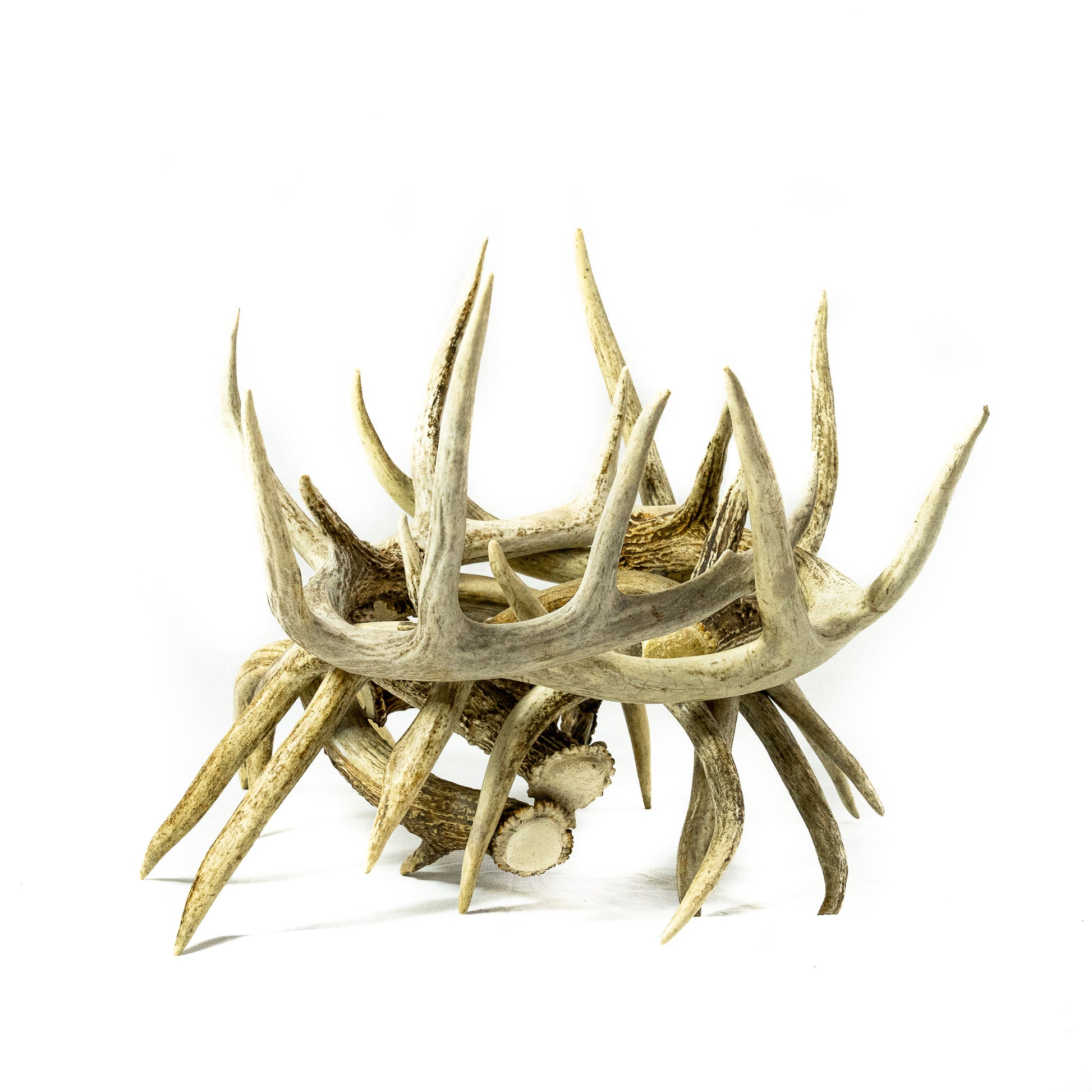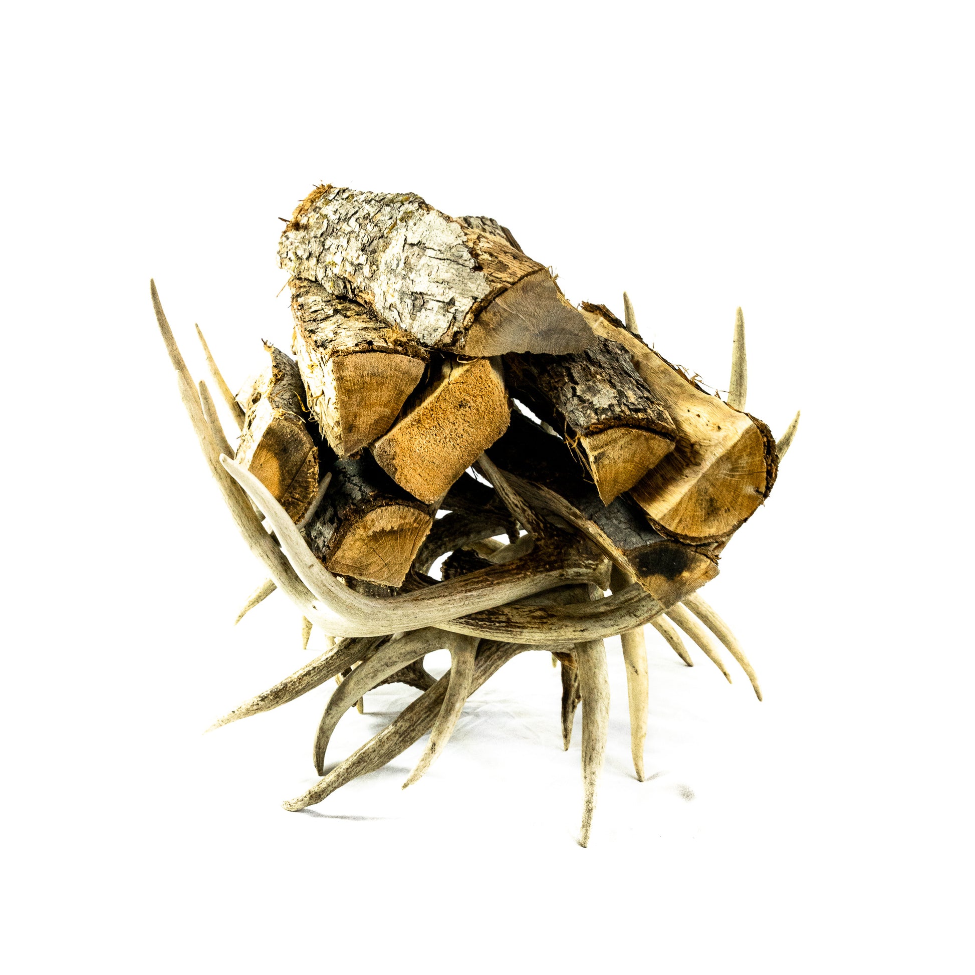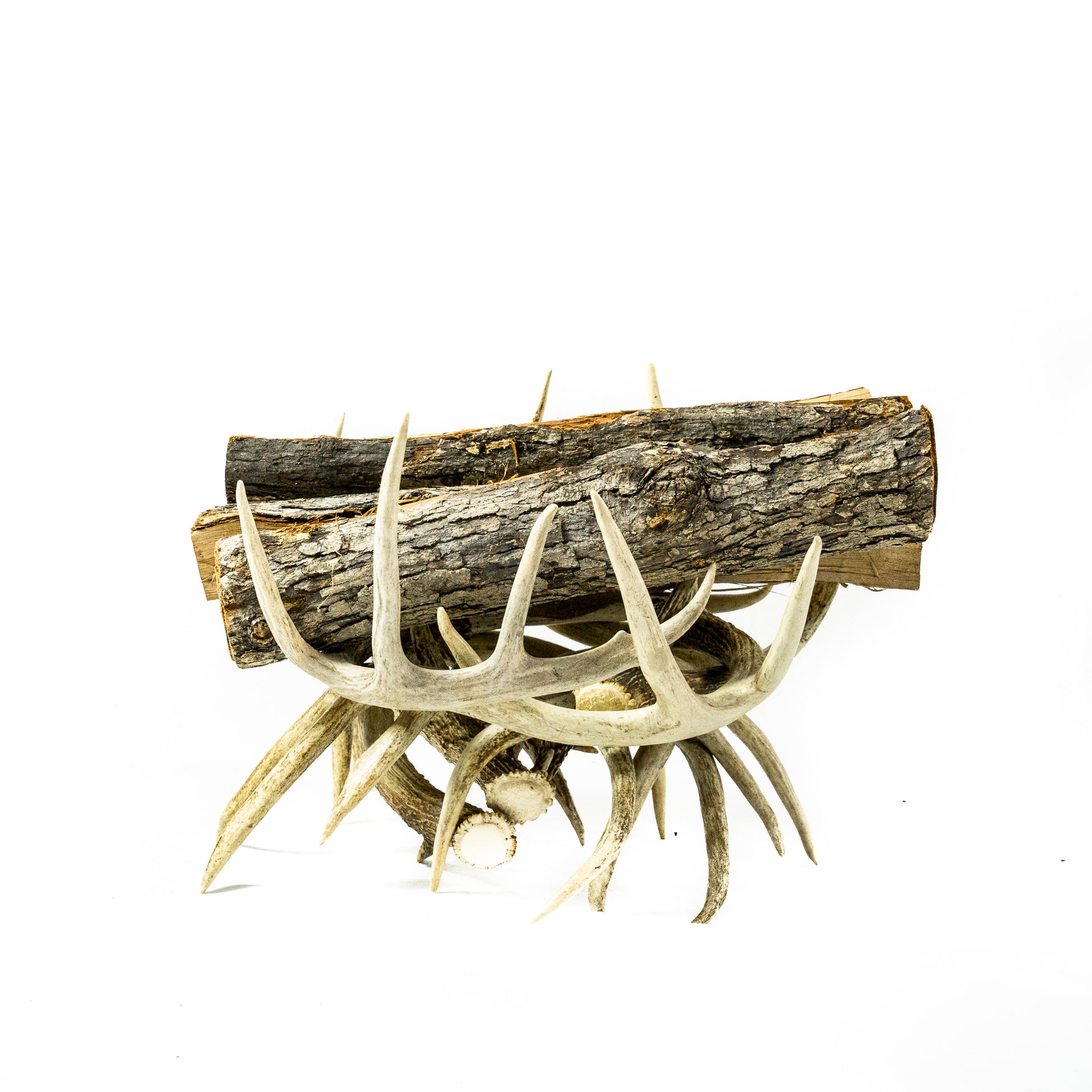 The whitetail antler log holder is constructed using 6-8 Grade A shed whitetail antlers which are screwed together then patched and colored to blend seamlessly with the natural beauty of the antlers. The finished piece measures approximately 16" x 24" x 18" and holds 5-6 medium logs.