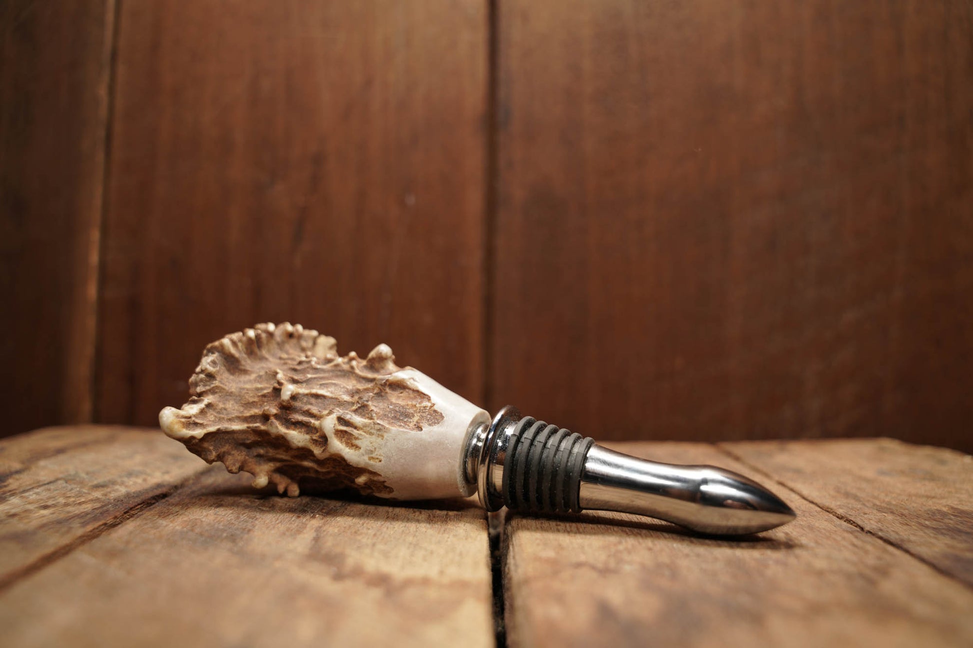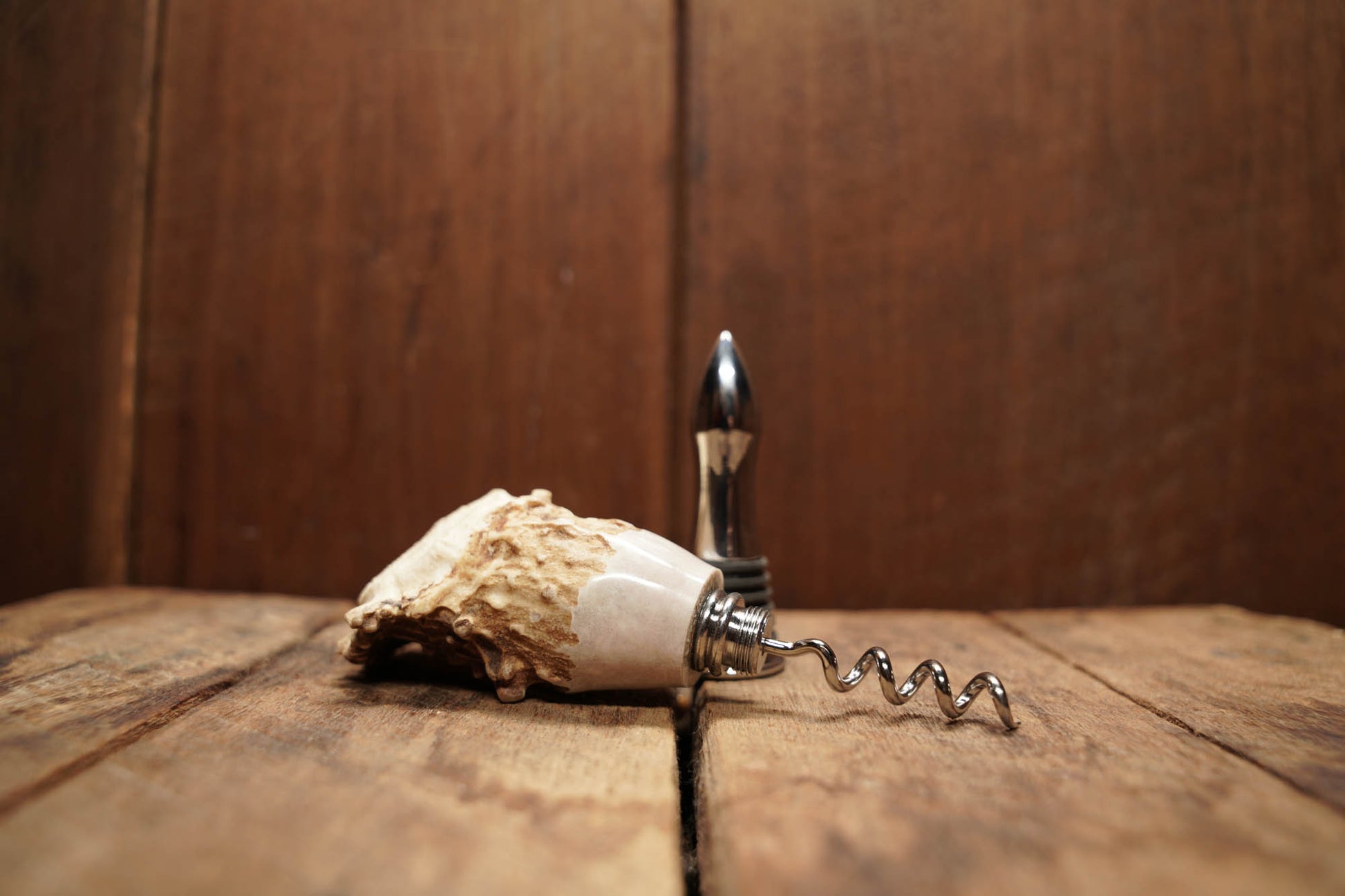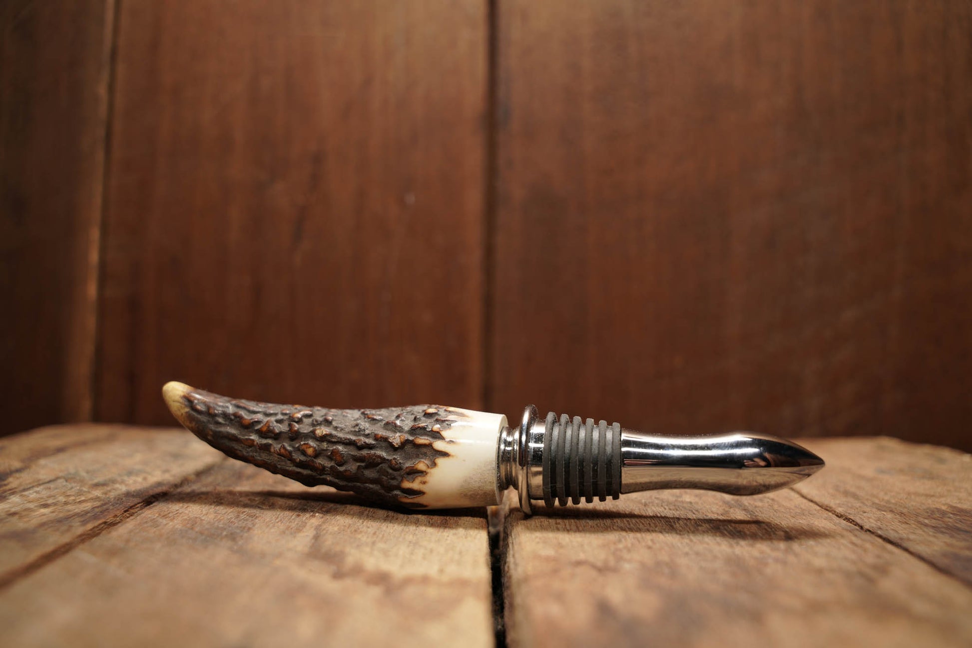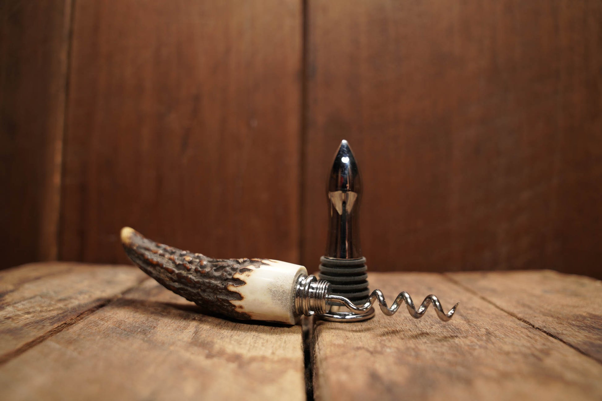 These bottle stoppers unscrew at the base of the antler and have a corkscrew to open bottles. It screws back together to be used again as a bottle stopper.